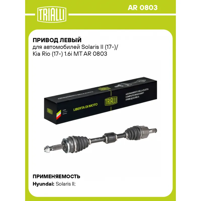 Привод левый для автомобилей Solaris II (17-)/ Kia Rio (17-) 1.6i MT Характеристики: Артикул: AR 0803 OEM номера: 49500-H5200 Особенности конструкции:: с демпфером Гарантийный срок: 2 года/60 000 км Парный товар: AR 0804 Количество на автомобиль: 1 Ось (сторона установки): передняя, левая Внешнее зубчатое соединение со стороны колеса (внеш.): 25 Внешнее зубчатое соединение со стороны КПП (внутр.): 25 Длина, мм: 660 Диаметр вала,мм: 25 Тип КПП: 6 MT Сопутствующий товар: ШРУСы: GO 0824, GO 0895, GO 0856 Сопутствующий товар: Ремонтные комплекты ШРУСов: FG 0806, FG 0805 Сопутствующий товар: Приводы: AR 0804 Товарная линейка: BLACK Подходит для авто: Hyundai Solaris II (17-) Для проверки применяемости отправьте VIN автомобиля через вкладку "Есть вопросы о товаре?" Комплектация: Привод в сборе - 1 шт Гайка - 1 шт Гарантийный талон - 1 шт Гарантия: от 1 года.