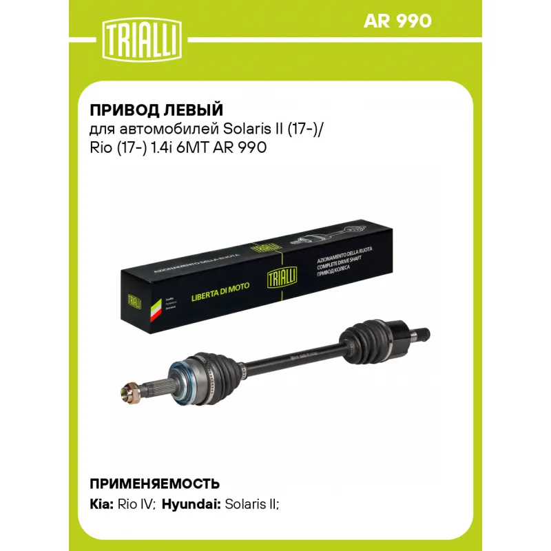 Привод левый для автомобилей Solaris II (17-)/ Rio (17-) 1.4i 6MT Характеристики: Артикул: AR 990 OEM номера: 49500-H5000 Гарантийный срок: 2 года/60 000 км Парный товар: AR 991 Количество на автомобиль: 1 Ось (сторона установки): передняя, левая Внешнее зубчатое соединение со стороны колеса (внеш.): 25 Внешнее зубчатое соединение со стороны КПП (внутр.): 25 Длина, мм: 674 Диаметр вала,мм: 25 Тип КПП: 6 MT Сопутствующий товар: ШРУСы: GO 0824, GO 0895, GO 0856 Сопутствующий товар: Ремонтные комплекты ШРУСов: FG 0806, FG 0805 Сопутствующий товар: Приводы: AR 991 Товарная линейка: BLACK Подходит для авто: Kia Rio IV (17-) Hyundai Solaris II (17-) Для проверки применяемости отправьте VIN автомобиля через вкладку "Есть вопросы о товаре?" Комплектация: Привод в сборе - 1 шт Гайка - 1 шт Гарантийный талон - 1 шт Гарантия: от 1 года.