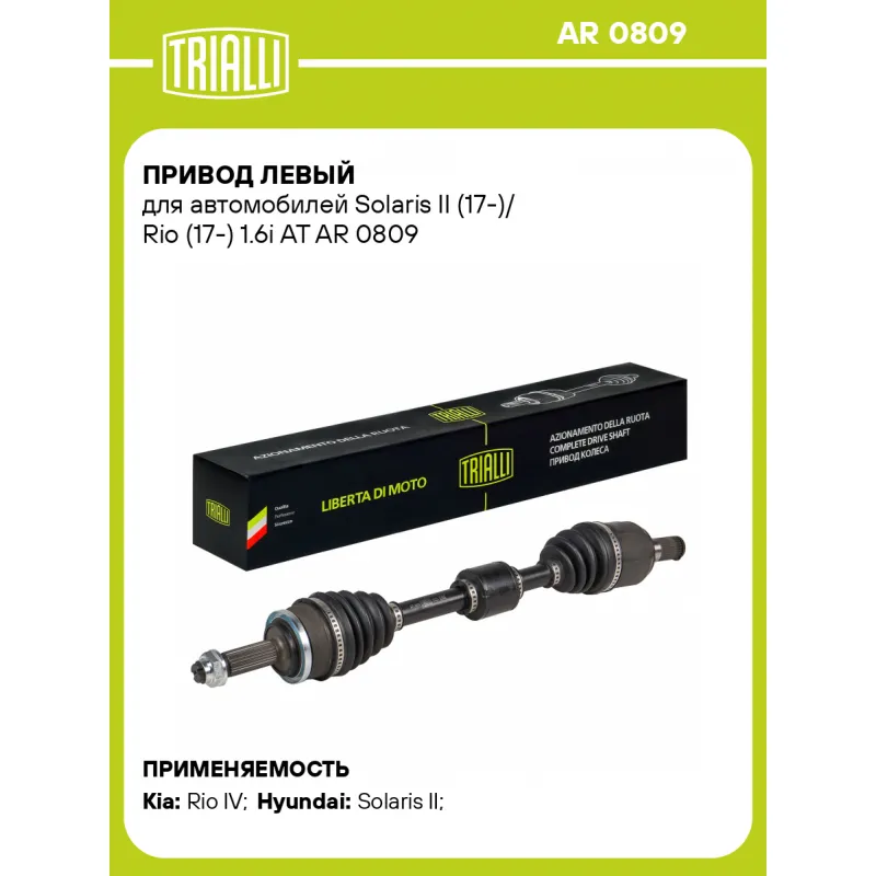 Привод левый для автомобилей Solaris II (17-)/ Rio (17-) 1.6i AT Характеристики: Артикул: AR 0809 OEM номера: 49500-H5300 Особенности конструкции:: с демпфером Гарантийный срок: 2 года/60 000 км Парный товар: AR 0810 Количество на автомобиль: 1 Ось (сторона установки): передняя, левая Внешнее зубчатое соединение со стороны колеса (внеш.): 25 Внешнее зубчатое соединение со стороны КПП (внутр.): 27 Длина, мм: 641 Диаметр вала,мм: 25 Тип КПП: 6 AT Сопутствующий товар: ШРУСы: GO 0823, GO 0824,GO 0808 Сопутствующий товар: Ремонтные комплекты ШРУСов: FG 0805, FG 0806 Сопутствующий товар: Приводы: AR 0810 Товарная линейка: BLACK Подходит для авто: Kia Rio IV (17-) Hyundai Solaris II (17-) Для проверки применяемости отправьте VIN автомобиля через вкладку "Есть вопросы о товаре?" Комплектация: Привод в сборе - 1 шт Гайка - 1 шт Гарантийный талон - 1 шт Гарантия: от 1 года.