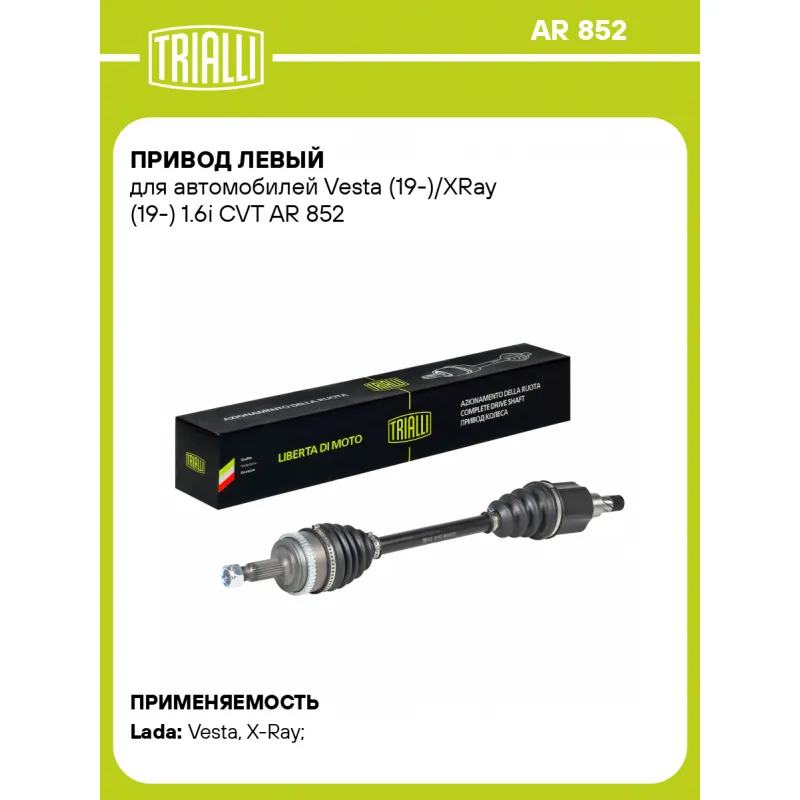 Привод левый для автомобилей Vesta (19-)/XRay (19-) 1.6i CVT Характеристики: Артикул: AR 852 OEM номера: 391011979R Гарантийный срок: 2 года/60 000 км Количество на автомобиль: 1 Ось (сторона установки): передняя левая Внешнее зубчатое соединение со стороны колеса (внеш.): 23 Внешнее зубчатое соединение со стороны КПП (внутр.): 25 Количество зубьев ABS: 48 Длина, мм: 658 Диаметр вала,мм: 25 Тип КПП: CVT Сопутствующий товар: ШРУСы: GO 839 Сопутствующий товар: Ремонтные комплекты ШРУСов: FG 840 Сопутствующий товар: Приводы: AR 853, AR 862 Товарная линейка: BLACK Подходит для авто: ВАЗ Vesta (15-), X-Ray (15-) Для проверки применяемости отправьте VIN автомобиля через вкладку "Есть вопросы о товаре?" Комплектация: Привод в сборе - 1 шт Гайка - 1 шт Гарантийный талон - 1 шт Гарантия: от 1 года.