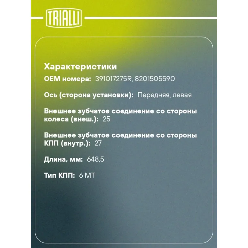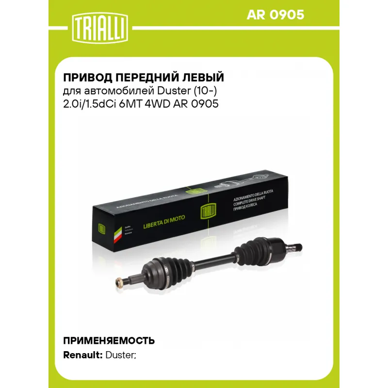 Привод передний левый для автомобилей Duster (10-) 2.0i/1.5dCi 6MT 4WD Характеристики: Артикул: AR 0905 OEM номера: 391017275R, 8201505590 Сопутствующие товары:: GO 0903, GO 0904, FG 0903, FG 0904, AR 0910 Гарантийный срок: 2 года/60 000 км Парный товар: AR 0910 Количество на автомобиль: 1 Ось (сторона установки): передняя, левая Внешнее зубчатое соединение со стороны колеса (внеш.): 25 Внешнее зубчатое соединение со стороны КПП (внутр.): 27 Длина, мм: 648.5 Диаметр вала,мм: 28 Тип КПП: 6 MT Товарная линейка: BLACK Подходит для авто: Renault Duster (10-) Для проверки применяемости отправьте VIN автомобиля через вкладку "Есть вопросы о товаре?" Комплектация: Привод в сборе - 1 шт Гайка - 1 шт Гарантия: от 1 года.