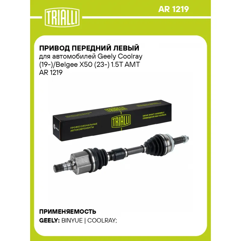 Привод передний левый для автомобилей Geely Coolray (19-)/Belgee X50 (23-) 1.5T AMT Характеристики: Артикул: AR 1219 OEM номера: 4082067100 Особенности конструкции:: с депфером Ось (сторона установки): передняя, левая Длина, мм: 612,5 Внешнее зубчатое соединение со стороны КПП (внутр.): 28 Количество зубьев ABS: 48 Внешнее зубчатое соединение со стороны колеса (внеш.): 27 Тип КПП: AMT Гарантийный срок: 2 года/60 000 км Сопутствующий товар: ШРУСы: GO 700, GO 702 Сопутствующий товар: Приводы: AR 1218 Парный товар: AR 1218 Количество на автомобиль: 1 Товарная линейка: BLACK Комплектация: Привод в сборе - 1 шт Гайка - 1 шт Гарантия: от 1 года.