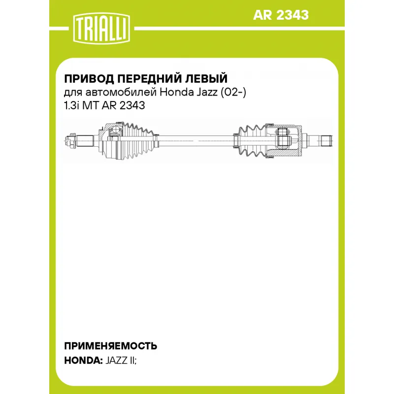 Привод передний левый для автомобилей Honda Jazz (02-) 1.3i MT Характеристики: Артикул: AR 2343 OEM номера: 44306SELT00, 44306SAAE00, 44306SENP00 Ось (сторона установки): передняя, левая Длина, мм: 612,5 Внешнее зубчатое соединение со стороны КПП (внутр.): 25 Внешнее зубчатое соединение со стороны колеса (внеш.): 26 Тип КПП: MT Гарантийный срок: 2 года/60 000 км Сопутствующий товар: ШРУСы: GO 2344 Сопутствующий товар: Приводы: AR 2344 Парный товар: AR 2344 Количество на автомобиль: 1 Товарная линейка: BLACK Комплектация: Гайка - 1 шт Привод в сборе - 1 шт Гарантия: от 1 года.