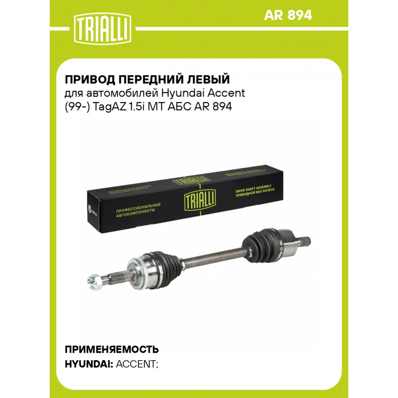 Привод передний левый для автомобилей Hyundai Accent (99-) TagAZ 1.5i MT АБС Характеристики: Артикул: AR 894 OEM номера: 49500-25301 Ось (сторона установки): передняя левая Длина, мм: 622 Внешнее зубчатое соединение со стороны КПП (внутр.): 25 Количество зубьев ABS: 44 Внешнее зубчатое соединение со стороны колеса (внеш.): 25 Тип КПП: MT Гарантийный срок: 2 года/60 000 км Сопутствующий товар: Приводы: AR 895 Парный товар: AR 895 Количество на автомобиль: 1 Товарная линейка: BLACK Комплектация: Привод в сборе - 1 шт Гайка - 1 шт Шплинт - 1 шт Гарантия: от 1 года.