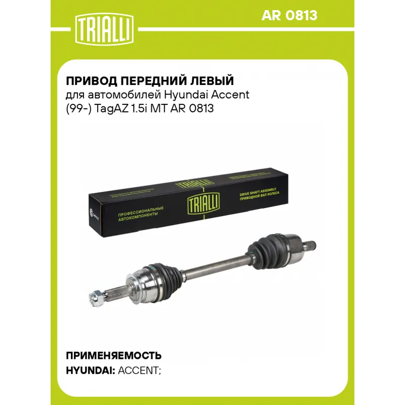 Привод передний левый для автомобилей Hyundai Accent (99-) TagAZ 1.5i MT Характеристики: Артикул: AR 0813 OEM номера: 49500-25200 Ось (сторона установки): передняя, левая Длина, мм: 622 Внешнее зубчатое соединение со стороны КПП (внутр.): 25 Внешнее зубчатое соединение со стороны колеса (внеш.): 25 Диаметр вала,мм: 24.5 Тип КПП: MT Гарантийный срок: 2 года/60 000 км Сопутствующий товар: Приводы: AR 0814 Парный товар: AR 0814 Количество на автомобиль: 1 Товарная линейка: BLACK Комплектация: Привод в сборе - 1 шт Гайка - 1 шт Шплинт - 1 шт Гарантия: от 1 года.