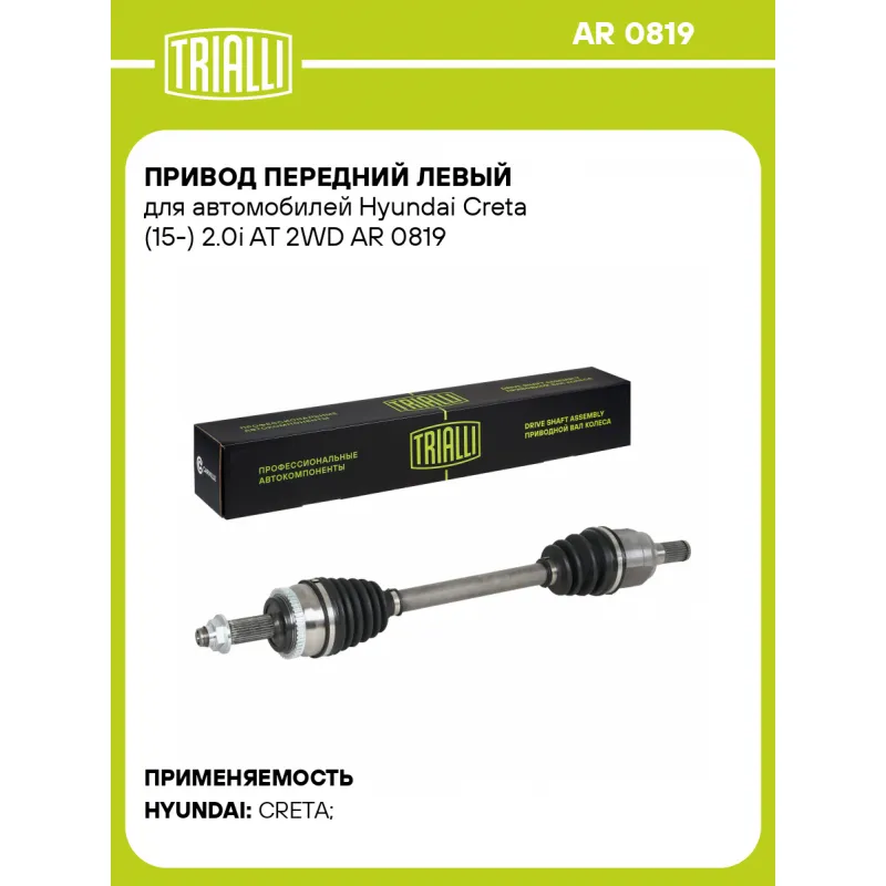 Привод передний левый для автомобилей Hyundai Creta (15-) 2.0i AT 2WD Характеристики: Артикул: AR 0819 OEM номера: 49500M0200, 49500-M4200 Ось (сторона установки): передняя, левая Длина, мм: 659 Внешнее зубчатое соединение со стороны КПП (внутр.): 27 Количество зубьев ABS: 46 Внешнее зубчатое соединение со стороны колеса (внеш.)... Читать полностью →