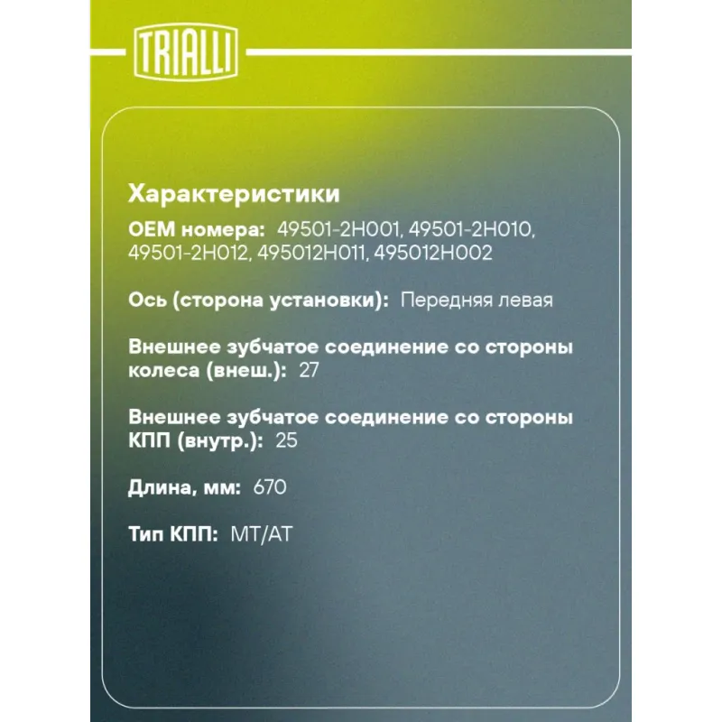 Привод передний левый для автомобилей Hyundai Elantra HD (06-) 1.6i MT/AT Характеристики: Артикул: AR 0833 OEM номера: 49501-2H001, 49501-2H010, 49501-2H012, 495012H011, 495012H002 Ось (сторона установки): передняя левая Длина, мм: 670 Внешнее зубчатое соединение со стороны КПП (внутр.): 25 Количество зубьев ABS: 46 Внешнее зубчатое соединение со стороны колеса (внеш.): 27 Диаметр вала,мм: 24,5 Тип КПП: MT/AT Гарантийный срок: 2 года/60 000 км Сопутствующий товар: Приводы: AR 0834 Парный товар: AR 0834 Количество на автомобиль: 1 Товарная линейка: BLACK Комплектация: Привод в сборе - 1 шт Гайка - 1 шт Шплинт - 1 шт Гарантия: от 1 года.