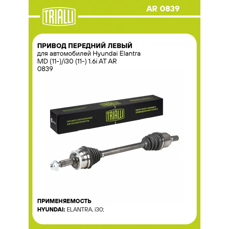Привод передний левый для автомобилей Hyundai Elantra MD (11-)/i30 (11-) 1.6i AT Характеристики: Артикул: AR 0839 OEM номера: 495003X100, 49500-A6400, 49500-A7100 Ось (сторона установки): передний левый Длина, мм: 668 Внешнее зубчатое соединение со стороны КПП (внутр.): 27 Количество зубьев ABS: 46 Внешнее зубчатое соединение со стороны колеса (внеш.): 27 Тип КПП: AT Гарантийный срок: 2 года/60 000 км Сопутствующий товар: Приводы: AR 0840 Парный товар: AR 0840 Количество на автомобиль: 1 Товарная линейка: BLACK Комплектация: Привод в сборе - 1 шт Гайка - 1 шт Гарантия: от 1 года.