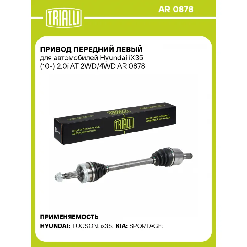 Привод передний левый для автомобилей Hyundai iX35 (10-) 2.0i AT 2WD/4WD Характеристики: Артикул: AR 0878 OEM номера: 49500-2Y610, 49500-2Y210 Ось (сторона установки): передняя левая Длина, мм: 682 Внешнее зубчатое соединение со стороны КПП (внутр.): 27 Количество зубьев ABS: 48 Внешнее зубчатое соединение со стороны колеса (внеш.): 27 Тип КПП: АТ Гарантийный срок: 2 года/60 000 км Сопутствующий товар: Приводы: AR 0848, AR 0850 Количество на автомобиль: 1 Товарная линейка: BLACK Комплектация: Привод в сборе - 1 шт Гайка - 1 шт Гарантия: от 1 года.
