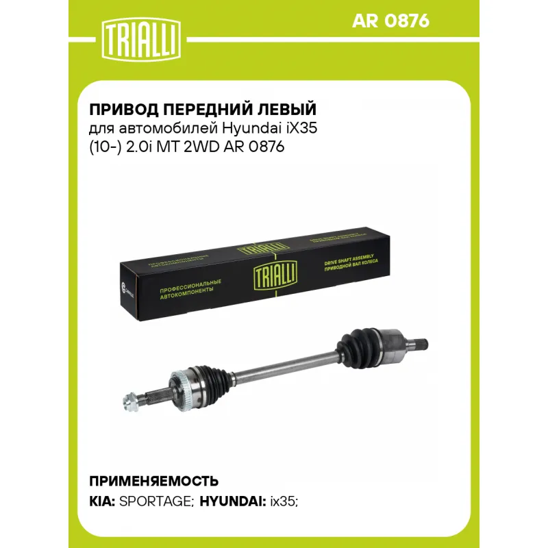 Привод передний левый для автомобилей Hyundai iX35 (10-) 2.0i MT 2WD Характеристики: Артикул: AR 0876 OEM номера: 495002Y710, 49500-2Y300 Ось (сторона установки): передняя левая Длина, мм: 696 Внешнее зубчатое соединение со стороны КПП (внутр.): 27 Количество зубьев ABS: 48 Внешнее зубчатое соединение со стороны колеса (внеш.): 27 Тип КПП: МТ Гарантийный срок: 2 года/60 000 км Количество на автомобиль: 1 Товарная линейка: BLACK Комплектация: Привод в сборе - 1 шт Гайка - 1 шт Гарантия: от 1 года.