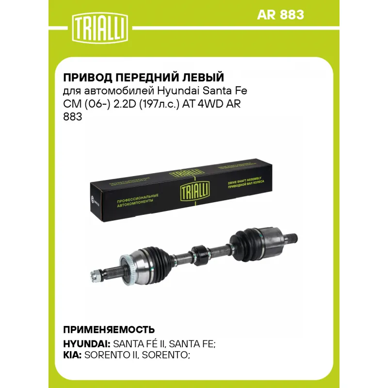 Привод передний левый для автомобилей Hyundai Santa Fe CM (06-) 2.2D (197л.с.) AT 4WD Характеристики: Артикул: AR 883 OEM номера: 495002B700 Особенности конструкции:: с демпфером Ось (сторона установки): передняя левая Длина, мм: 654 Внешнее зубчатое соединение со стороны КПП (внутр.): 31 Количество зубьев ABS: 52 Внешнее зубчатое соединение со стороны колеса (внеш.): 30 Тип КПП: АТ Гарантийный срок: 2 года/60 000 км Количество на автомобиль: 1 Товарная линейка: BLACK Комплектация: Шайба - 1 шт Шплинт - 1 шт Гайка - 1 шт Привод в сборе - 1 шт Гарантия: от 1 года.