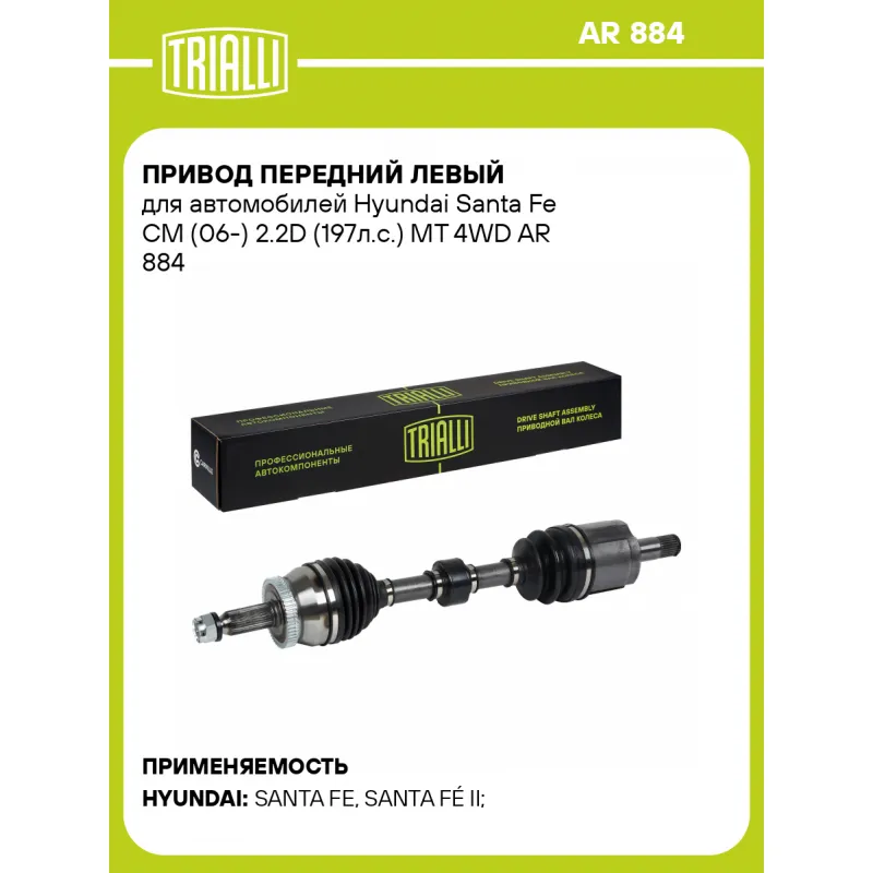 Привод передний левый для автомобилей Hyundai Santa Fe CM (06-) 2.2D (197л.с.) MT 4WD Характеристики: Артикул: AR 884 OEM номера: 495002B750 Особенности конструкции:: с демпфером Ось (сторона установки): передняя левая Длина, мм: 656 Внешнее зубчатое соединение со стороны КПП (внутр.): 28 Количество зубьев ABS: 52 Внешнее зубчатое соединение со стороны колеса (внеш.): 30 Тип КПП: МТ Гарантийный срок: 2 года/60 000 км Количество на автомобиль: 1 Товарная линейка: BLACK Комплектация: Шайба - 1 шт Шплинт - 1 шт Привод в сборе - 1 шт Гайка - 1 шт Гарантия: от 1 года.