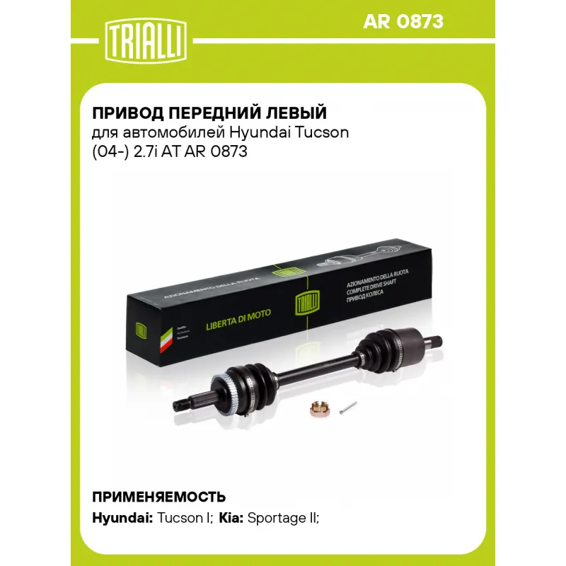 Привод передний левый для автомобилей Hyundai Tucson (04-) 2.7i AT Характеристики: Артикул: AR 0873 OEM номера: 49501-2E900, 49501-2E500, 49501-2F500 Сопутствующие товары:: GO 0814 Гарантийный срок: 2 года/60 000 км Парный товар: AR 0874 Количество на автомобиль: 1 Ось (сторона установки): передняя, левая Внешнее зубчатое соединение со стороны колеса (внеш.): 27 Внешнее зубчатое соединение со стороны КПП (внутр.): 27 Длина, мм: 668 Диаметр вала,мм: 27.5 Тип КПП: 4 AT Сопутствующий товар: Приводы: AR 0872 Товарная линейка: BLACK Подходит для авто: Hyundai Tucson I (04-) Kia Sportage II (04-) Для проверки применяемости отправьте VIN автомобиля через вкладку "Есть вопросы о товаре?" Комплектация: Привод в сборе - 1 шт Гайка - 1 шт Гарантийный талон - 1 шт Шплинт - 1 шт Гарантия: от 1 года.