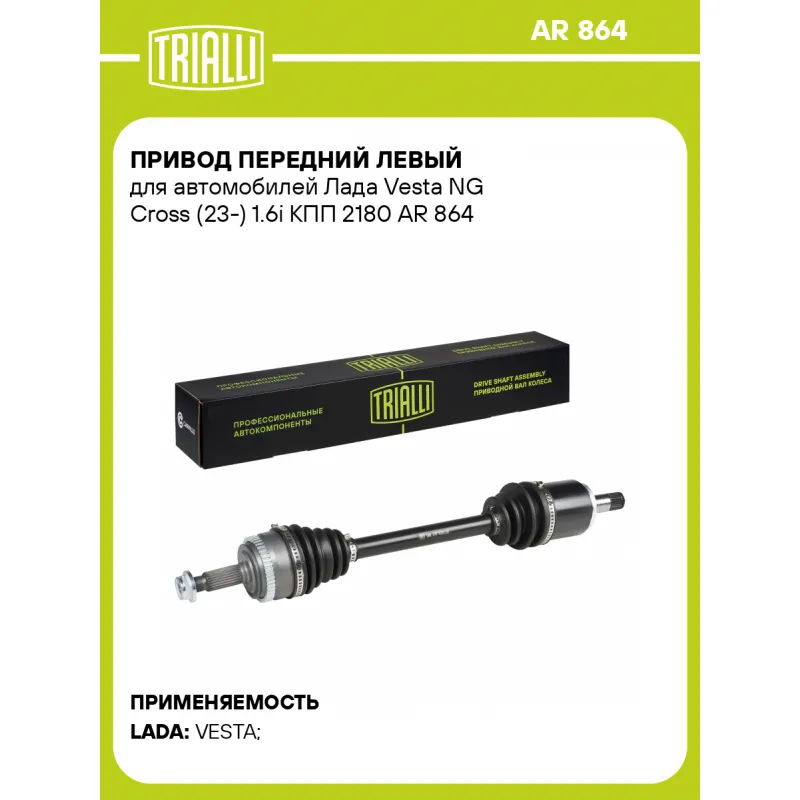 Привод передний левый для автомобилей Лада Vesta NG Cross (23-) 1.6i КПП 2180 Характеристики: Артикул: AR 864 OEM номера: 8450034731 Ось (сторона установки): передняя, левая Длина, мм: 654 Внешнее зубчатое соединение со стороны КПП (внутр.): 24 Количество зубьев ABS: 48 Внешнее зубчатое соединение со стороны колеса (внеш.): 23 Диаметр вала,мм: 26,5 Тип КПП: МТ Гарантийный срок: 2 года/60 000 км Сопутствующий товар: Приводы: AR 863 Парный товар: AR 863 Количество на автомобиль: 1 Товарная линейка: BLACK Комплектация: Привод в сборе - 1 шт Гайка - 1 шт Гарантия: от 1 года.