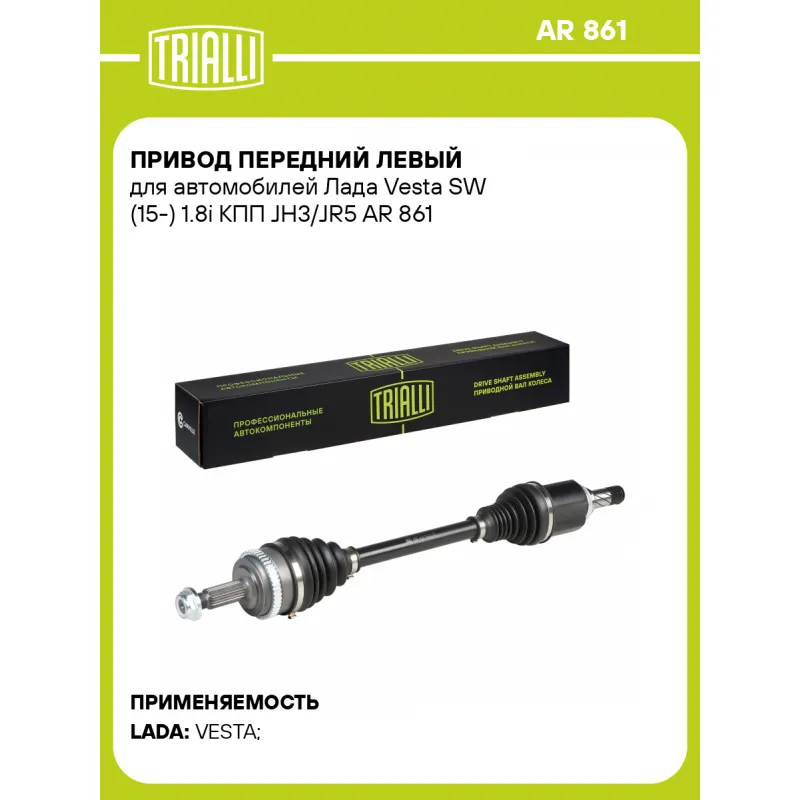 Привод передний левый для автомобилей Лада Vesta SW (15-) 1.8i КПП JH3/JR5 Характеристики: Артикул: AR 861 OEM номера: 8450030791 Ось (сторона установки): передняя, левая Длина, мм: 645 Внешнее зубчатое соединение со стороны КПП (внутр.): 26 Количество зубьев ABS: 48 Внешнее зубчатое соединение со стороны колеса (внеш.): 23 Диаметр вала,мм: 25 Тип КПП: МТ Гарантийный срок: 2 года/60 000 км Сопутствующий товар: ШРУСы: GO 839 Сопутствующий товар: Приводы: AR 860 Парный товар: AR 860 Количество на автомобиль: 1 Товарная линейка: BLACK Комплектация: Привод в сборе - 1 шт Гайка - 1 шт Гарантия: от 1 года.
