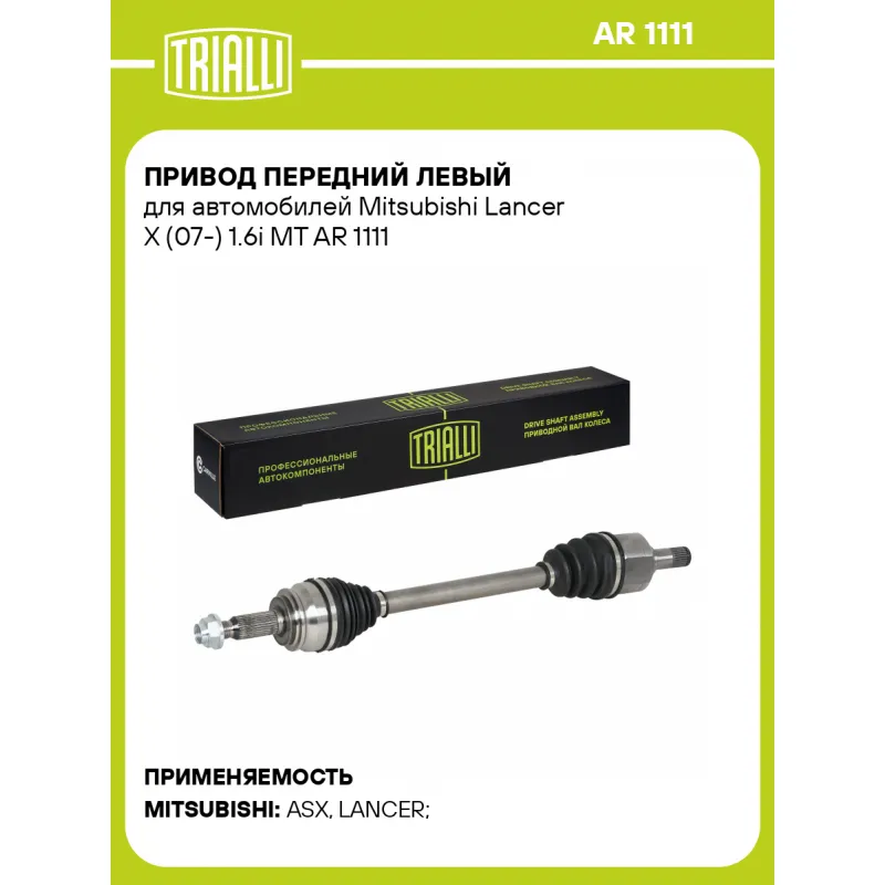 Привод передний левый для автомобилей Mitsubishi Lancer X (07-) 1.6i MT Характеристики: Артикул: AR 1111 OEM номера: 3815A437, 3815A457 Ось (сторона установки): передняя, левая Длина, мм: 669 Внешнее зубчатое соединение со стороны КПП (внутр.): 27 Внешнее зубчатое соединение со стороны колеса (внеш.): 28 Тип КПП: MT Гарантийный срок: 2 года/60 000 км Сопутствующий товар: ШРУСы: GO 1124, GO 1165 Сопутствующий товар: Приводы: AR 1112 Количество на автомобиль: 1 Товарная линейка: BLACK Комплектация: Привод в сборе - 1 шт Гайка - 1 шт Гарантия: от 1 года.