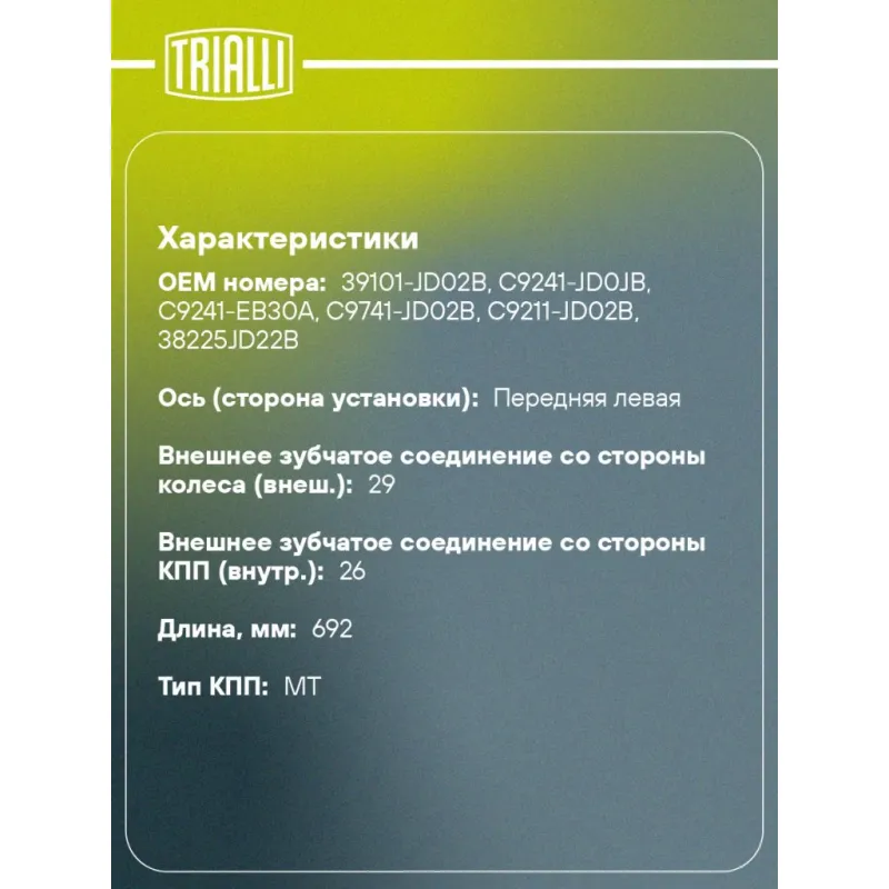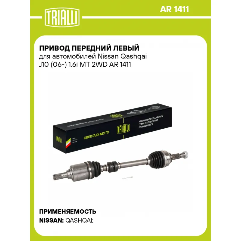 Привод передний левый для автомобилей Nissan Qashqai J10 (06-) 1.6i MT 2WD Характеристики: Артикул: AR 1411 OEM номера: 39101-JD02B, C9241-JD0JB, C9241-EB30A, C9741-JD02B, C9211-JD02B, 38225JD22B Особенности конструкции:: с демпфером Гарантийный срок: 2 года/60 000 км Парный товар: AR 1412 Количество на автомобиль: 1 Ось (сторона установки): передняя левая Внешнее зубчатое соединение со стороны колеса (внеш.): 29 Внешнее зубчатое соединение со стороны КПП (внутр.): 26 Длина, мм: 692 Тип КПП: MT Товарная линейка: BLACK Комплектация: Привод в сборе - 1 шт Гайка - 1 шт Шплинт - 1 шт Гарантия: от 1 года.