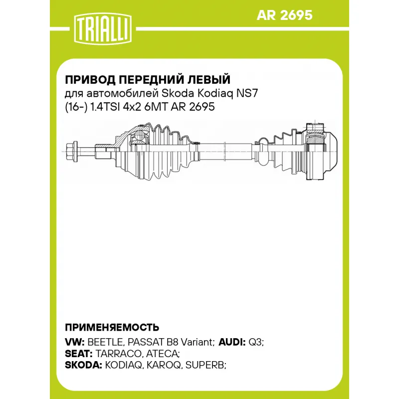 Привод передний левый для автомобилей Skoda Kodiaq NS7 (16-) 1.4TSI 4x2 6MT Характеристики: Артикул: AR 2695 OEM номера: 3Q0407761HX, 3Q0407271A Ось (сторона установки): передняя, левая Длина, мм: 501 Внешнее зубчатое соединение со стороны колеса (внеш.): 36 Тип КПП: MT Гарантийный срок: 2 года/60 000 км Сопутствующий товар: Приводы: AR 2694 Парный товар: AR 2694 Количество на автомобиль: 1 Товарная линейка: BLACK Комплектация: Привод в сборе - 1 шт Болт - 7 шт Гарантия: от 1 года.