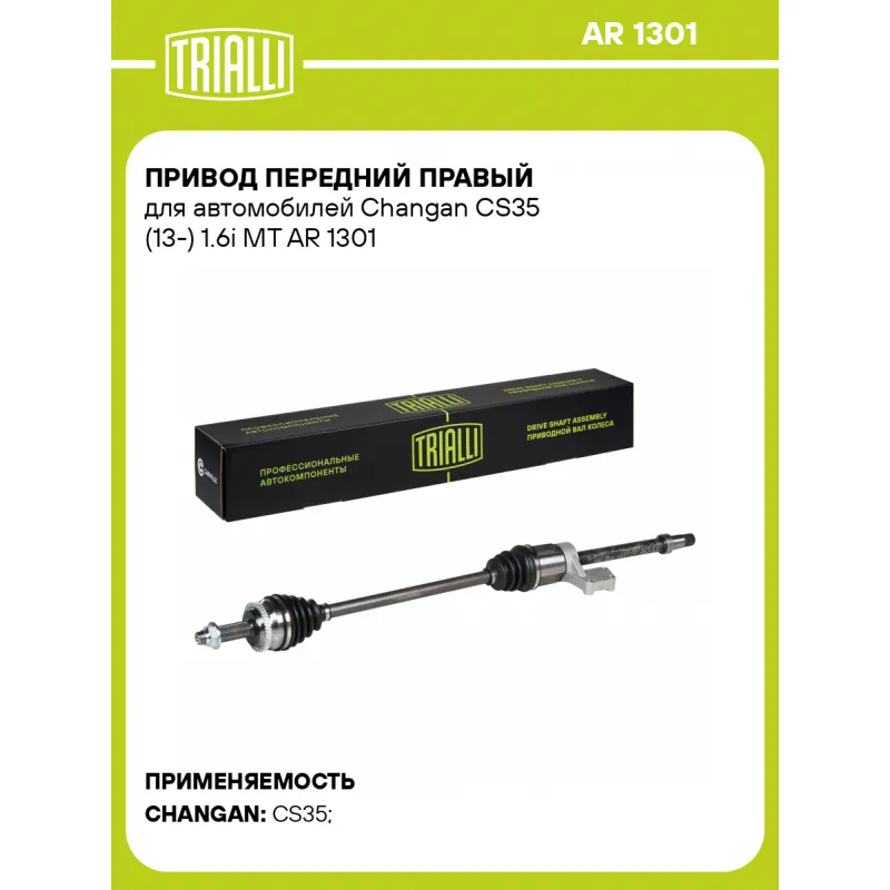Привод передний правый для автомобилей Changan CS35 (13-) 1.6i MT Характеристики: Артикул: AR 1301 OEM номера: S101051-0300, S101051-0300-AA Особенности конструкции:: с кронштейном Ось (сторона установки): передняя, правая Длина, мм: 1000,5 Внешнее зубчатое соединение со стороны КПП (внутр.): 23 Количество зубьев ABS: 46 Внешнее зубчатое соединение со стороны колеса (внеш.): 27 Тип КПП: AT Гарантийный срок: 2 года/60 000 км Сопутствующий товар: Приводы: AR 1302 Парный товар: AR 1302 Количество на автомобиль: 1 Товарная линейка: BLACK Комплектация: Гайка - 1 шт Привод в сборе - 1 шт Гарантия: от 1 года.