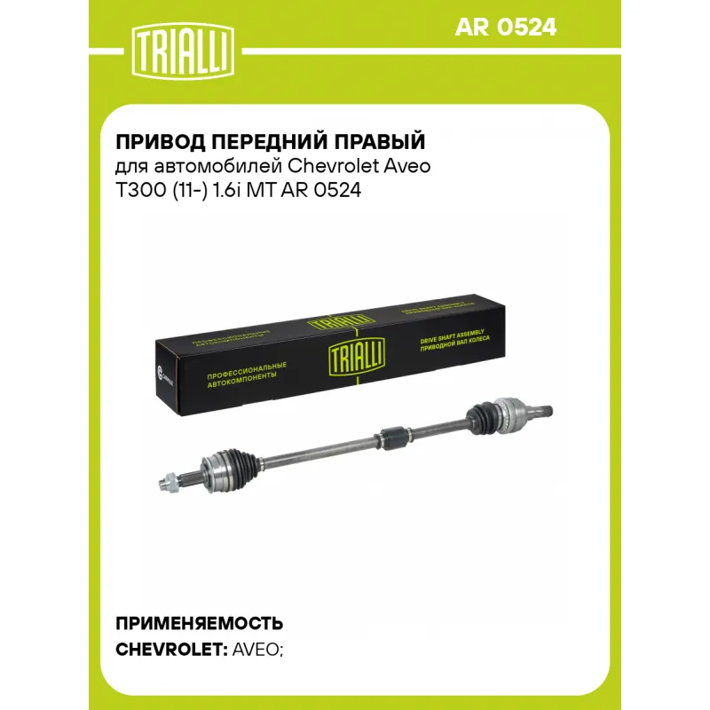 Привод передний правый для автомобилей Chevrolet Aveo T300 (11-) 1.6i MT Характеристики: Артикул: AR 0524 OEM номера: 95194889 Особенности конструкции:: с демпфером Ось (сторона установки): передняя, правая Длина, мм: 934 Внешнее зубчатое соединение со стороны КПП (внутр.): 34 Внешнее зубчатое соединение со стороны колеса (внеш.): 25 Тип КПП: MT Гарантийный срок: 2 года/60 000 км Сопутствующий товар: ШРУСы: GO 0555, GO 0518 Сопутствующий товар: Приводы: AR 0523 Парный товар: AR 0523 Количество на автомобиль: 1 Товарная линейка: BLACK Комплектация: Привод в сборе - 1 шт Гайка - 1 шт Гарантия: от 1 года.