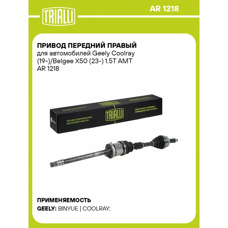 Привод передний правый для автомобилей Geely Coolray (19-)/Belgee X50 (23-) 1.5T AMT Характеристики: Артикул: AR 1218 OEM номера: 4082066800 Особенности конструкции:: с опорным подшипником, кронштейном Ось (сторона установки): передняя, правая Длина, мм: 965 Внешнее зубчатое соединение со стороны КПП (внутр.): 28 Количество зубьев ABS: 48 Внешнее зубчатое соединение со стороны колеса (внеш.): 27 Тип КПП: AMT Гарантийный срок: 2 года/60 000 км Сопутствующий товар: ШРУСы: GO 700, GO 701 Сопутствующий товар: Приводы: AR 1219 Парный товар: AR 1219 Количество на автомобиль: 1 Товарная линейка: BLACK Комплектация: Привод в сборе - 1 шт Гайка - 1 шт Гарантия: от 1 года.