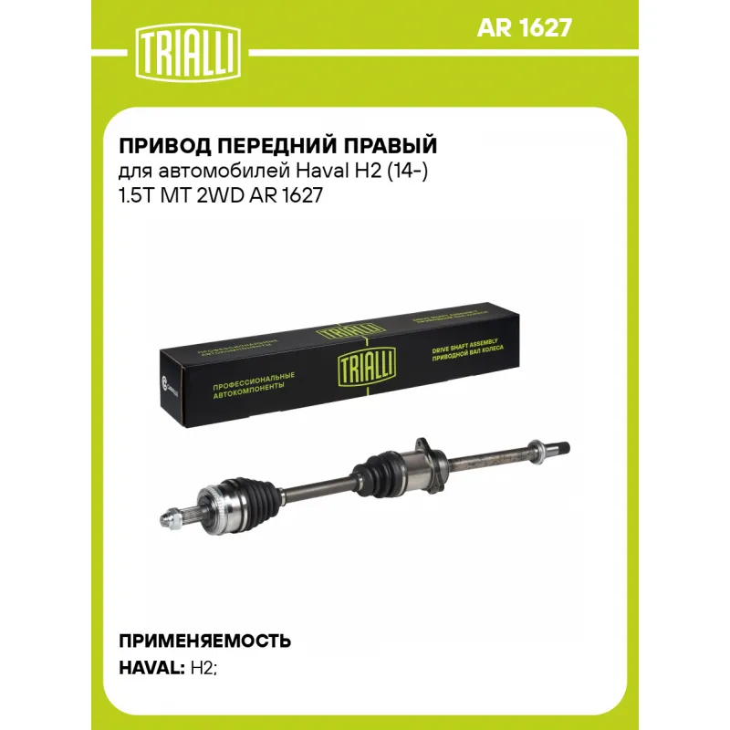 Привод передний правый для автомобилей Haval H2 (14-) 1.5T MT 2WD Характеристики: Артикул: AR 1627 OEM номера: 2303200ASZ08B, 2303200XSZ08B, 2303200XSZ08A, 2303200ASZ08A Особенности конструкции:: с кронштейном Ось (сторона установки): передняя, правая Длина, мм: 961,5 Внешнее зубчатое соединение со стороны КПП (внутр.): 37 Количество зубьев ABS: 48 Внешнее зубчатое соединение со стороны колеса (внеш.): 28 Тип КПП: AT Гарантийный срок: 2 года/60 000 км Сопутствующий товар: Приводы: AR 1626 Количество на автомобиль: 1 Товарная линейка: BLACK Комплектация: Гайка - 1 шт Привод в сборе - 1 шт Гарантия: от 1 года.