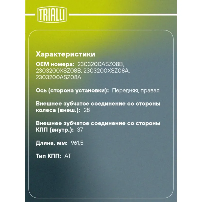 Привод передний правый для автомобилей Haval H2 (14-) 1.5T MT 2WD Характеристики: Артикул: AR 1627 OEM номера: 2303200ASZ08B, 2303200XSZ08B, 2303200XSZ08A, 2303200ASZ08A Особенности конструкции:: с кронштейном Ось (сторона установки): передняя, правая Длина, мм: 961,5 Внешнее зубчатое соединение со стороны КПП (внутр.): 37 Колич... Читать полностью →