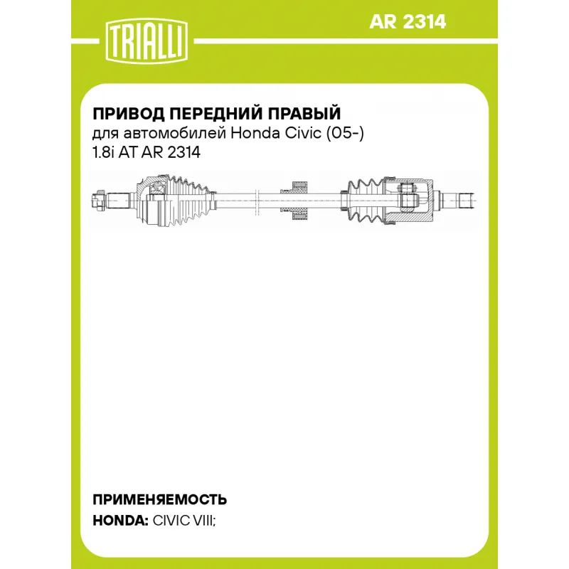 Привод передний правый для автомобилей Honda Civic (05-) 1.8i AT Характеристики: Артикул: AR 2314 OEM номера: 44305SNA000, 44305SNLT00 Особенности конструкции:: с демпфером Ось (сторона установки): передняя, правая Длина, мм: 912 Внешнее зубчатое соединение со стороны КПП (внутр.): 25 Внешнее зубчатое соединение со стороны колеса (внеш.): 26 Тип КПП: AT Гарантийный срок: 2 года/60 000 км Сопутствующий товар: ШРУСы: GO 2322, GO 2313 Сопутствующий товар: Приводы: AR 2313 Парный товар: AR 2313 Количество на автомобиль: 1 Товарная линейка: BLACK Комплектация: Привод в сборе - 1 шт Гайка - 1 шт Гарантия: от 1 года.