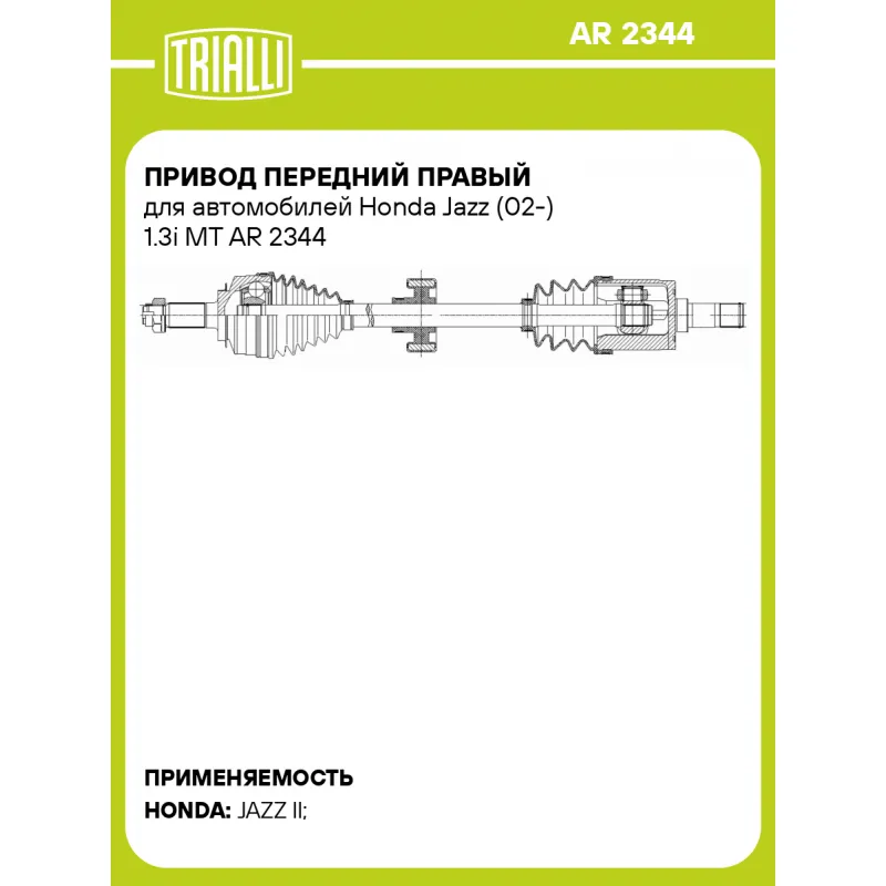 Привод передний правый для автомобилей Honda Jazz (02-) 1.3i MT Характеристики: Артикул: AR 2344 OEM номера: 44305SELT00, 44305SAAE00, 44305SENP00 Особенности конструкции:: с демпфером Ось (сторона установки): передняя, правая Длина, мм: 899 Внешнее зубчатое соединение со стороны КПП (внутр.): 25 Внешнее зубчатое соединение со стороны колеса (внеш.): 26 Тип КПП: MT Гарантийный срок: 2 года/60 000 км Сопутствующий товар: ШРУСы: GO 2344 Сопутствующий товар: Приводы: AR 2343 Парный товар: AR 2343 Количество на автомобиль: 1 Товарная линейка: BLACK Комплектация: Гайка - 1 шт Привод в сборе - 1 шт Гарантия: от 1 года.