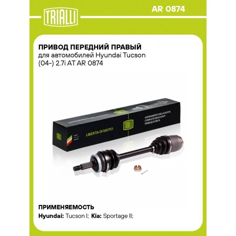 Привод передний правый для автомобилей Hyundai Tucson (04-) 2.7i AT Характеристики: Артикул: AR 0874 OEM номера: 49500-2E900, 49500-2E950 Сопутствующие товары:: GO 0814 Гарантийный срок: 2 года/60 000 км Парный товар: AR 0873 Количество на автомобиль: 1 Ось (сторона установки): передняя, правая Внешнее зубчатое соединение со стороны колеса (внеш.): 27 Внешнее зубчатое соединение со стороны КПП (внутр.): 26 Количество зубьев ABS: 48 Длина, мм: 604.5 Диаметр вала,мм: 27.5 Тип КПП: 4 AT Товарная линейка: BLACK Подходит для авто: Hyundai Tucson I (04-) Kia Sportage II (04-) Для проверки применяемости отправьте VIN автомобиля через вкладку "Есть вопросы о товаре?" Комплектация: Гарантийный талон - 1 шт Гайка - 1 шт Шплинт - 1 шт Привод в сборе - 1 шт Гарантия: от 1 года.