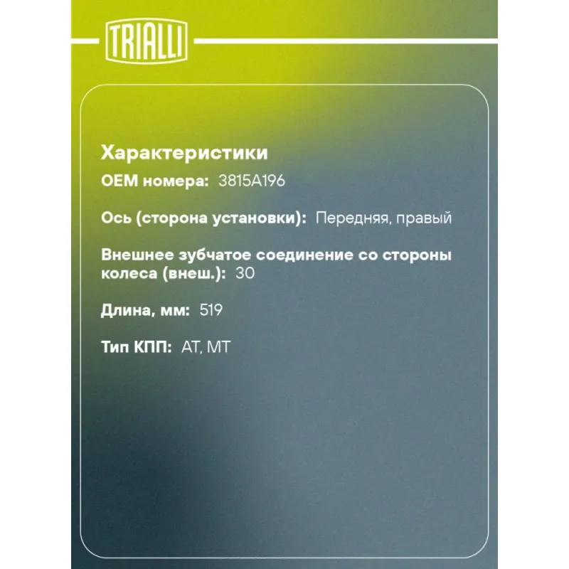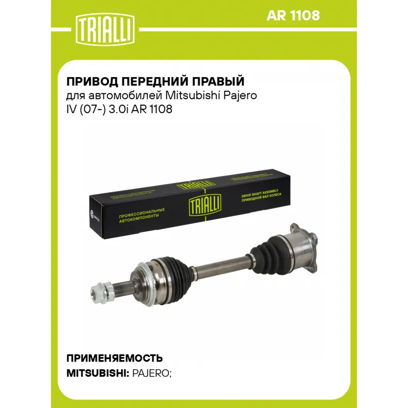 Привод передний правый для автомобилей Mitsubishi Pajero IV (07-) 3.0i Характеристики: Артикул: AR 1108 OEM номера: 3815A196 Ось (сторона установки): передняя, правый Длина, мм: 519 Количество зубьев ABS: 50 Внешнее зубчатое соединение со стороны колеса (внеш.): 30 Тип КПП: AT, MT Гарантийный срок: 2 года/60 000 км Сопутствующий товар: ШРУСы: GO 1126 Сопутствующий товар: Приводы: AR 1107, AR 1127, AR 1113, AR 1114 Количество на автомобиль: 1 Товарная линейка: BLACK Комплектация: Контровочная шайба - 1 шт Привод в сборе - 1 шт Гайка - 1 шт Шплинт - 1 шт Гарантия: от 1 года.