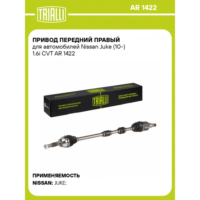 Привод передний правый для автомобилей Nissan Juke (10-) 1.6i CVT Характеристики: Артикул: AR 1422 OEM номера: 39100-1KA0B Особенности конструкции:: с демпфером Гарантийный срок: 2 года/60 000 км Количество на автомобиль: 1 Ось (сторона установки): передняя, правая Внешнее зубчатое соединение со стороны колеса (внеш.): 29 Внешнее зубчатое соединение со стороны КПП (внутр.): 25 Длина, мм: 940 Тип КПП: CVT Товарная линейка: BLACK Комплектация: Привод в сборе - 1 шт Гайка - 1 шт Шплинт - 1 шт Гарантия: от 1 года.