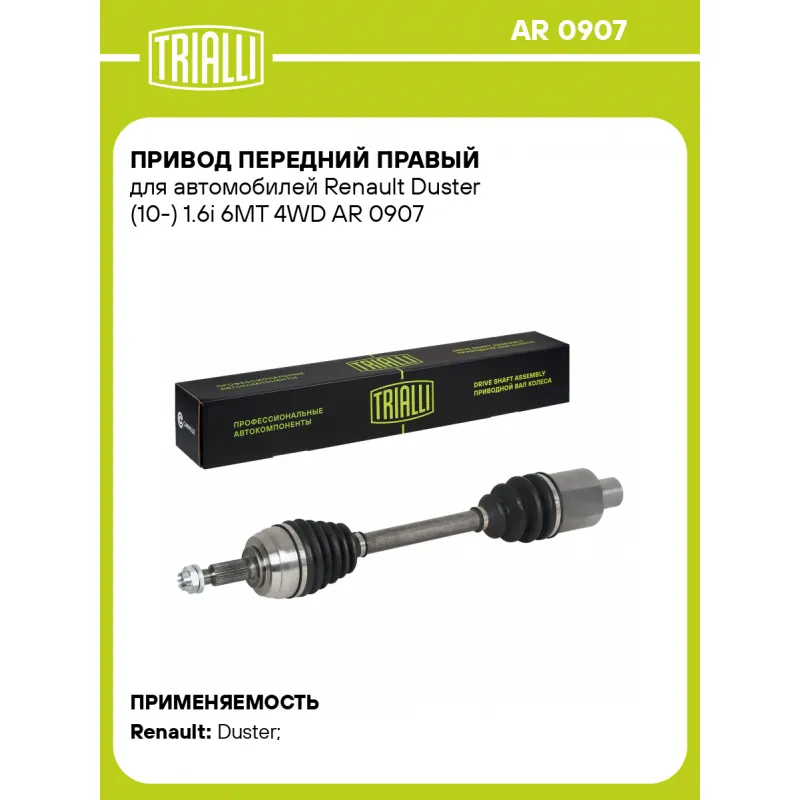 Привод передний правый для автомобилей Renault Duster (10-) 1.6i 6MT 4WD Характеристики: Артикул: AR 0907 OEM номера: 391001162R Длина, мм: 614 Внешнее зубчатое соединение со стороны КПП (внутр.): 31 Внешнее зубчатое соединение со стороны колеса (внеш.): 25 Тип КПП: MT Гарантийный срок: 2 года/60 000 км Сопутствующий товар: ШРУСы: GO 0902, GO 0907 Сопутствующий товар: Приводы: AR 0906 Количество на автомобиль: 1 Ось (сторона установки): передняя, правая Товарная линейка: BLACK Подходит для авто: Renault Duster (10-) Для проверки применяемости отправьте VIN автомобиля через вкладку "Есть вопросы о товаре?" Комплектация: Привод в сборе - 1 шт Гайка - 1 шт Гарантия: от 1 года.