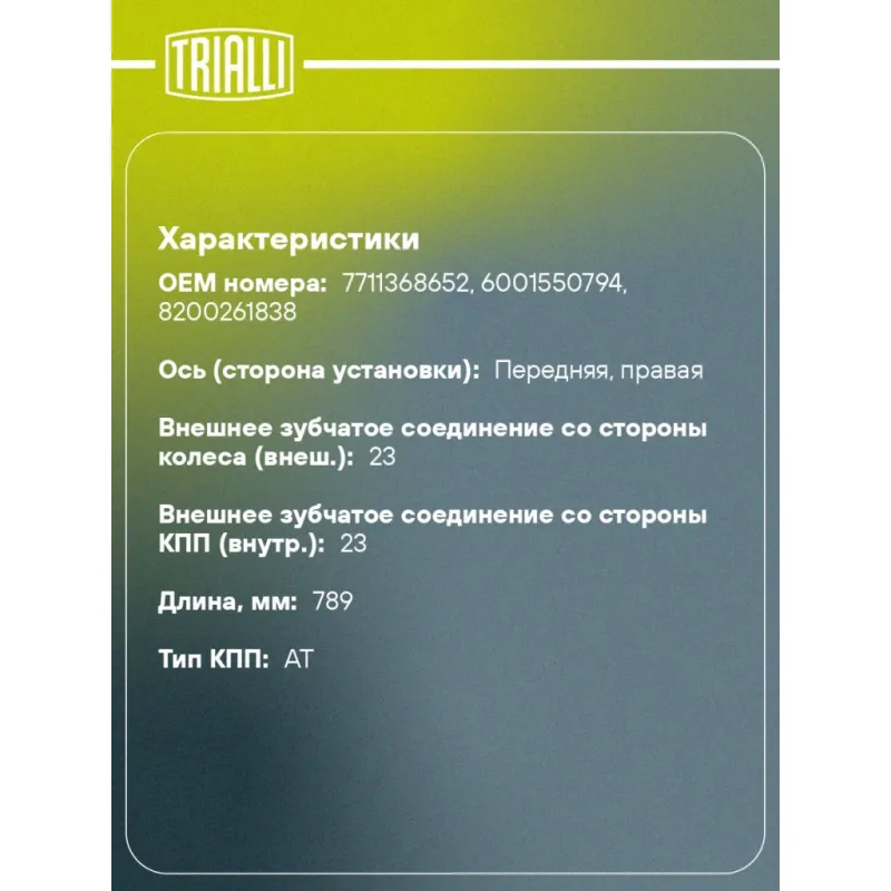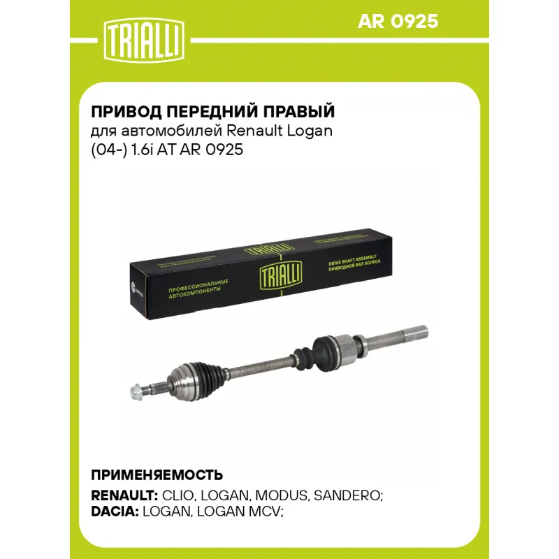 Привод передний правый для автомобилей Renault Logan (04-) 1.6i AT Характеристики: Артикул: AR 0925 OEM номера: 7711368652, 6001550794, 8200261838 Ось (сторона установки): передняя, правая Длина, мм: 789 Внешнее зубчатое соединение со стороны КПП (внутр.): 23 Внешнее зубчатое соединение со стороны колеса (внеш.): 23 Тип КПП: AT Гарантийный срок: 2 года/60 000 км Сопутствующий товар: ШРУСы: GO 0972, GO 0973 Сопутствующий товар: Приводы: AR 0924 Парный товар: AR 0924 Количество на автомобиль: 1 Товарная линейка: BLACK Комплектация: Гайка - 1 шт Привод в сборе - 1 шт Гарантия: от 1 года.