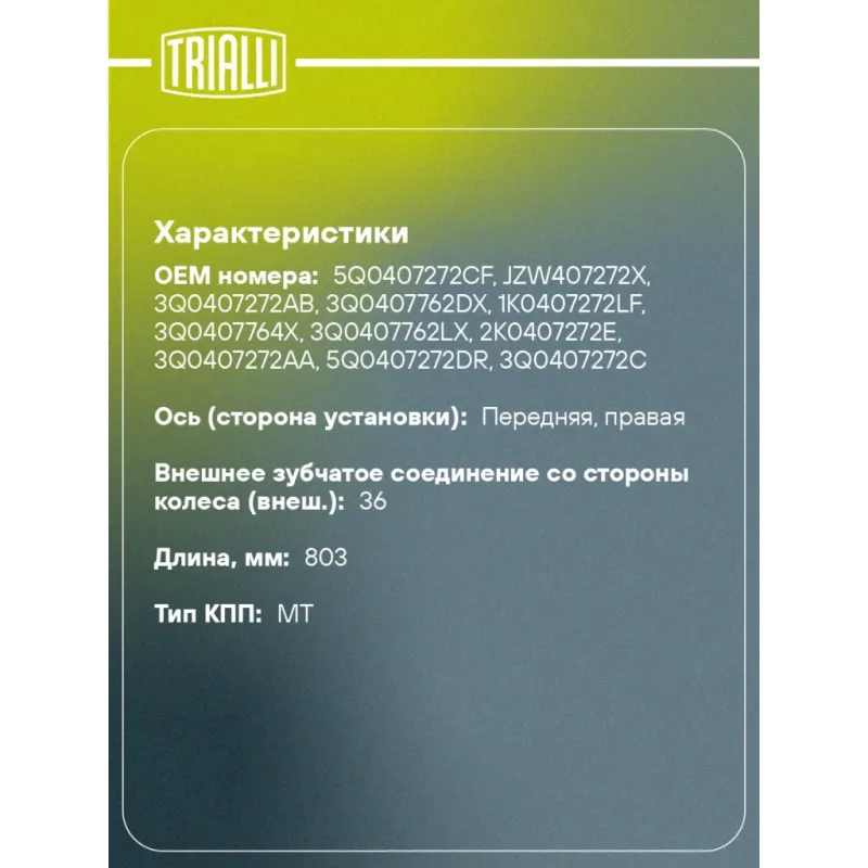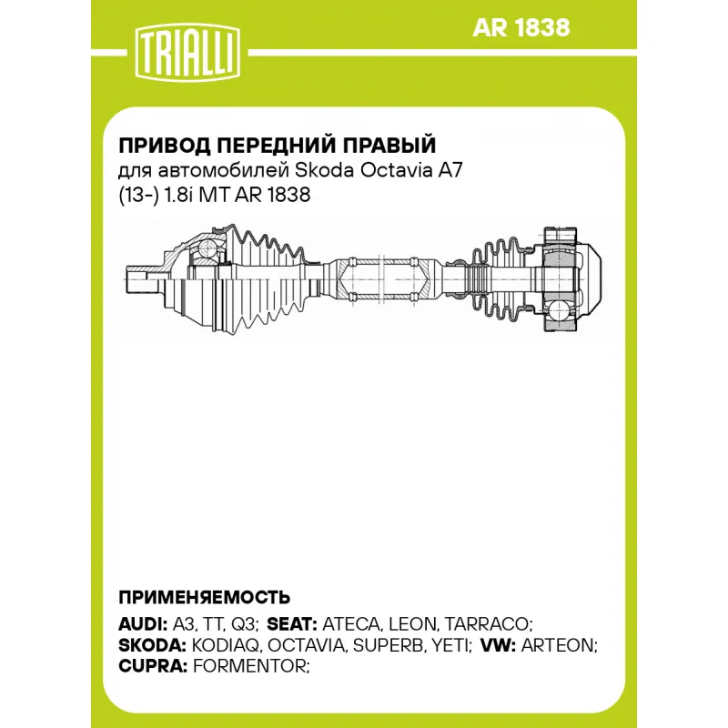 Привод передний правый для автомобилей Skoda Octavia A7 (13-) 1.8i MT Характеристики: Артикул: AR 1838 OEM номера: 5Q0407272CF, JZW407272X, 3Q0407272AB, 3Q0407762DX, 1K0407272LF, 3Q0407764X, 3Q0407762LX, 2K0407272E, 3Q0407272AA, 5Q0407272DR, 3Q0407272C, 1K0407456AX, 2K0407272EX Ось (сторона установки): передняя, правая Длина, мм... Читать полностью →