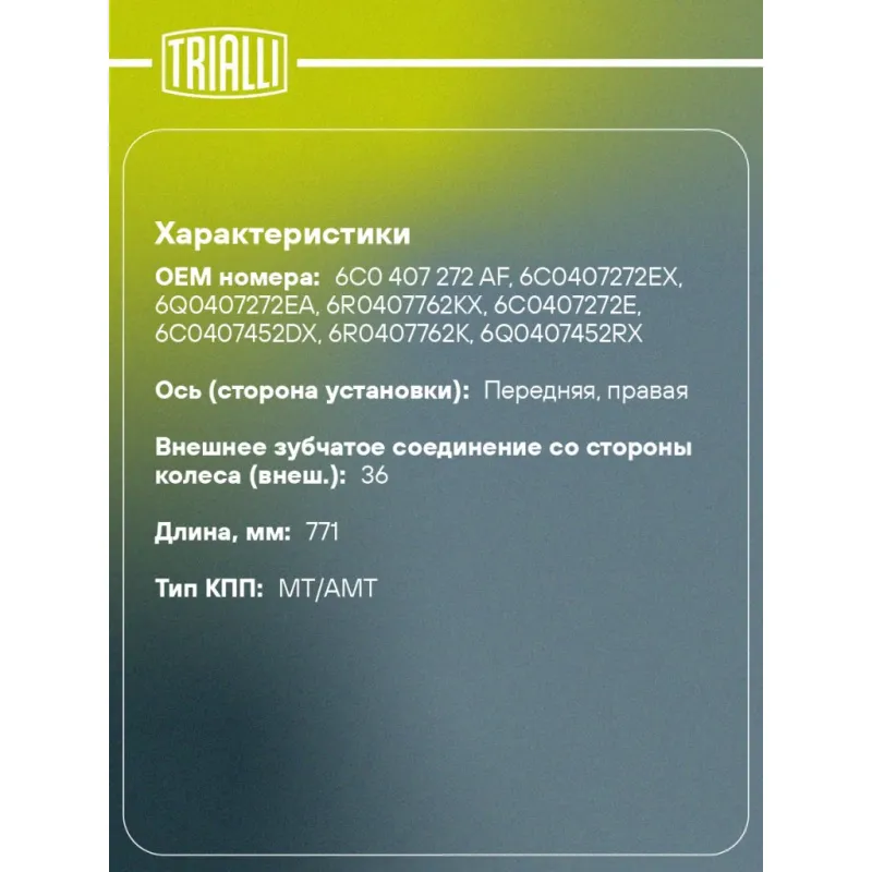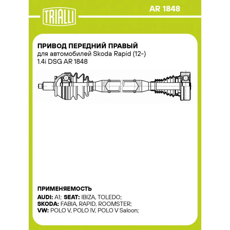 Привод передний правый для автомобилей Skoda Rapid (12-) 1.4i DSG Характеристики: Артикул: AR 1848 OEM номера: 6C0 407 272 AF, 6C0407272EX, 6Q0407272EA, 6R0407762KX, 6C0407272E, 6C0407452DX, 6R0407762K, 6Q0407452RX Ось (сторона установки): передняя, правая Длина, мм: 771 Внешнее зубчатое соединение со стороны колеса (внеш.): 36 Тип КПП: MT/AMT Гарантийный срок: 2 года/60 000 км Сопутствующий товар: ШРУСы: GO 1846 Сопутствующий товар: Приводы: AR 1847 Парный товар: AR 1847 Количество на автомобиль: 1 Товарная линейка: BLACK Комплектация: Болт - 6 шт Привод в сборе - 1 шт Гайка - 1 шт Гарантия: от 1 года.