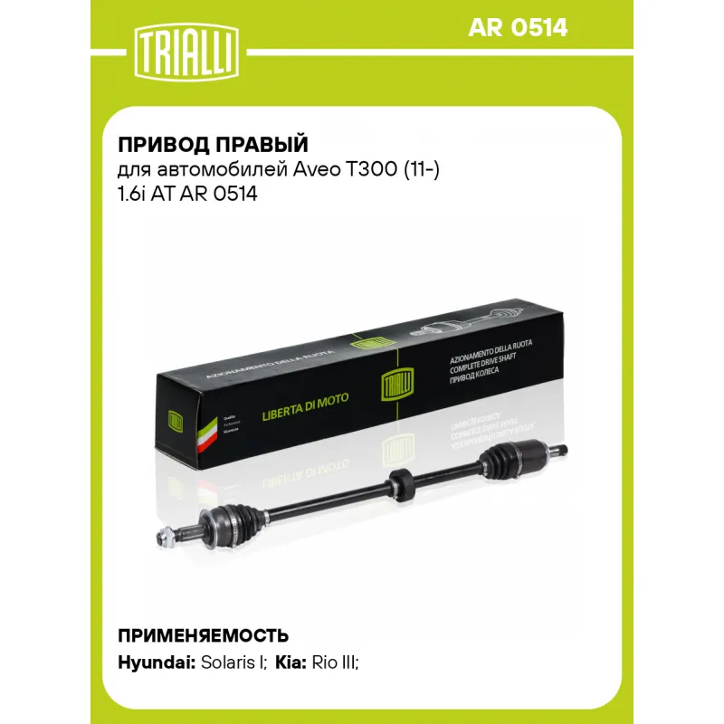 Привод правый для автомобилей Aveo T300 (11-) 1.6i AT Характеристики: Артикул: AR 0514 OEM номера: 95982916 Сопутствующие товары:: GO 0512, FG 0513, GO 0514, GO 0513 Особенности конструкции:: с демпфером Гарантийный срок: 2 года/60 000 км Парный товар: AR 0513 Количество на автомобиль: 1 Ось (сторона установки): передняя, правая Внешнее зубчатое соединение со стороны колеса (внеш.): 25 Внешнее зубчатое соединение со стороны КПП (внутр.): 22 Длина, мм: 925 Диаметр вала,мм: 25.5 Тип КПП: 6 AT Сопутствующий товар: ШРУСы: GO 0518, GO 0513, GO 0514 Сопутствующий товар: Ремонтные комплекты ШРУСов: FG 0519 Сопутствующий товар: Приводы: AR 0513 Товарная линейка: BLACK Подходит для авто: Hyundai Solaris I (10-) Kia Rio III (11-) Для проверки применяемости отправьте VIN автомобиля через вкладку "Есть вопросы о товаре?" Комплектация: Привод - 1 шт Гайка - 1 шт Гарантия: от 1 года.