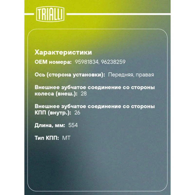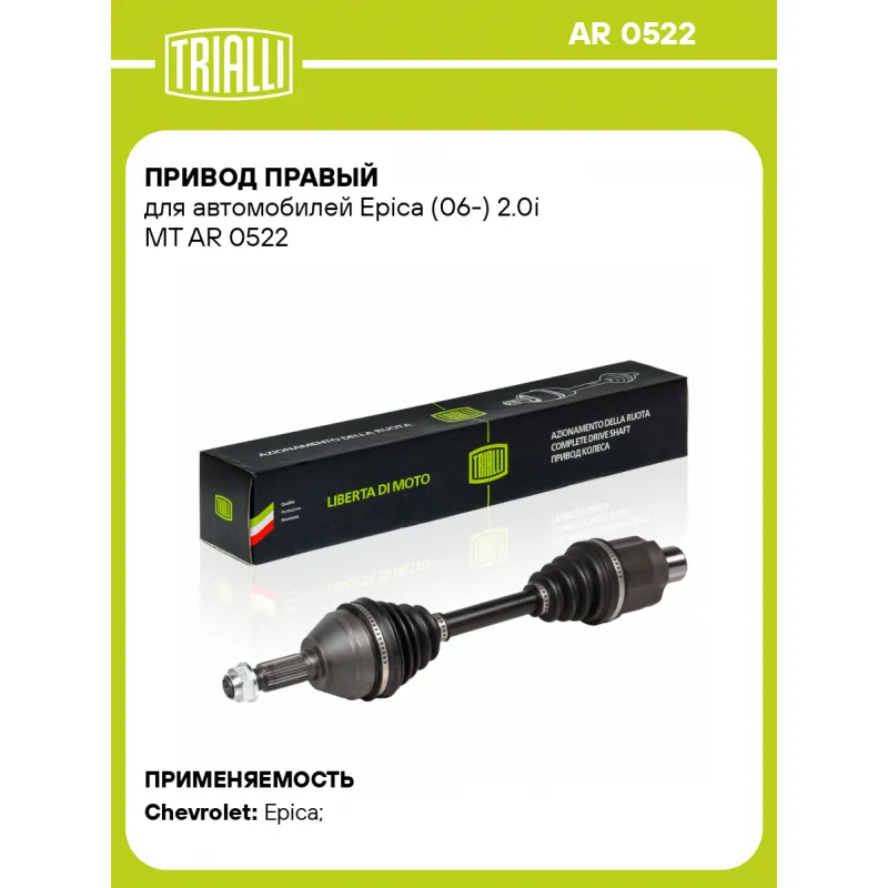 Привод правый для автомобилей Epica (06-) 2.0i MT Характеристики: Артикул: AR 0522 OEM номера: 95981834, 96238259 Гарантийный срок: 2 года/60 000 км Парный товар: AR 0521 Количество на автомобиль: 1 Ось (сторона установки): передняя, правая Внешнее зубчатое соединение со стороны колеса (внеш.): 28 Внешнее зубчатое соединение со стороны КПП (внутр.): 26 Длина, мм: 554 Диаметр вала,мм: 26.5 Тип КПП: MT Сопутствующий товар: ШРУСы: GO 0508, GO 0509, GO 0510 Сопутствующий товар: Ремонтные комплекты ШРУСов: FG 0508 Сопутствующий товар: Приводы: AR 0521 Товарная линейка: BLACK Подходит для авто: Chevrolet Epica (06-) Для проверки применяемости отправьте VIN автомобиля через вкладку "Есть вопросы о товаре?" Комплектация: Привод - 1 шт Гайка - 1 шт Гарантийный талон - 1 шт Гарантия: от 1 года.