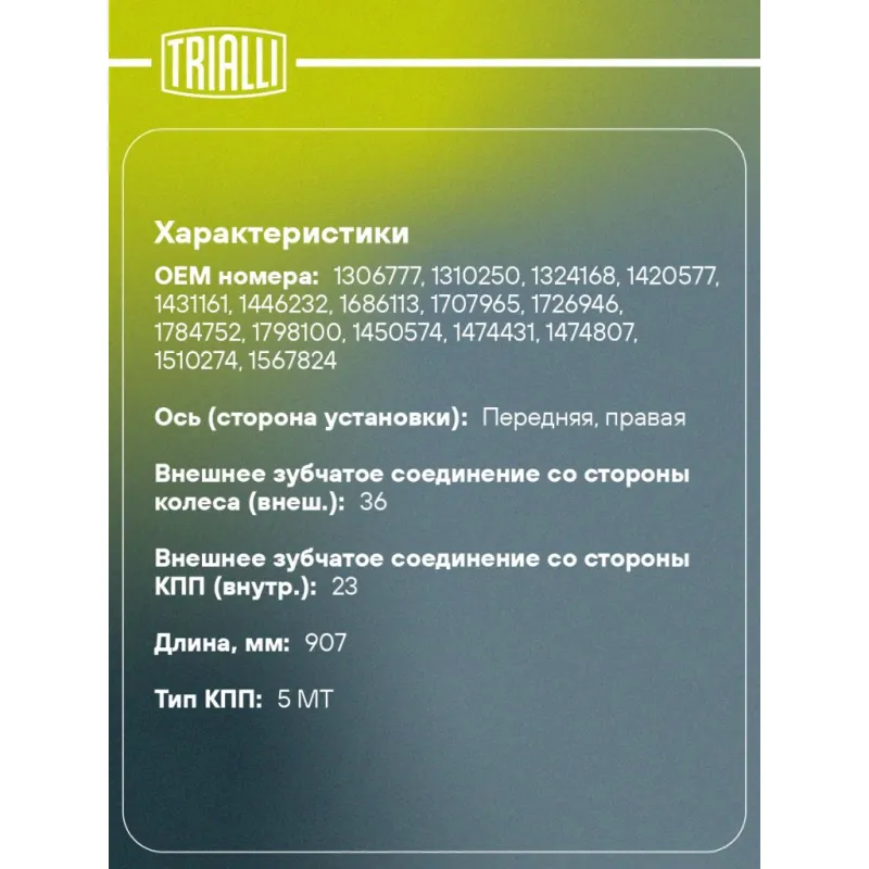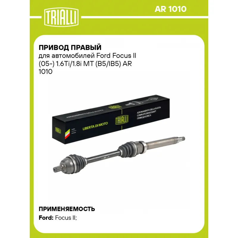 Привод правый для автомобилей Ford Focus II (05-) 1.6Ti/1.8i MT (B5/IB5) Характеристики: Артикул: AR 1010 OEM номера: 1306777, 1310250, 1324168, 1420577, 1431161, 1446232, 1686113, 1707965, 1726946, 1784752, 1798100, 1450574, 1474431, 1474807, 1510274, 1567824, 1682435 Гарантийный срок: 2 года/60 000 км Парный товар: AR 1009 Количество на автомобиль: 1 Ось (сторона установки): передняя, правая Внешнее зубчатое соединение со стороны колеса (внеш.): 36 Внешнее зубчатое соединение со стороны КПП (внутр.): 23 Длина, мм: 907 Диаметр вала,мм: 31 Тип КПП: 5 MT Сопутствующий товар: ШРУСы: GO 1013; GO 1014; GO 1026; GO 1061; GO 106101; GO 106103; GO 1064; GO 1065; GO 1066 Сопутствующий товар: Приводы: AR 1009 Товарная линейка: BLACK Подходит для авто: Ford Focus II (05-), Focus II (05-) Для проверки применяемости отправьте VIN автомобиля через вкладку "Есть вопросы о товаре?" Комплектация: Привод в сборе - 1 шт Болт - 1 шт Шайба - 1 шт Гарантийный талон - 1 шт Гарантия: от 1 года.