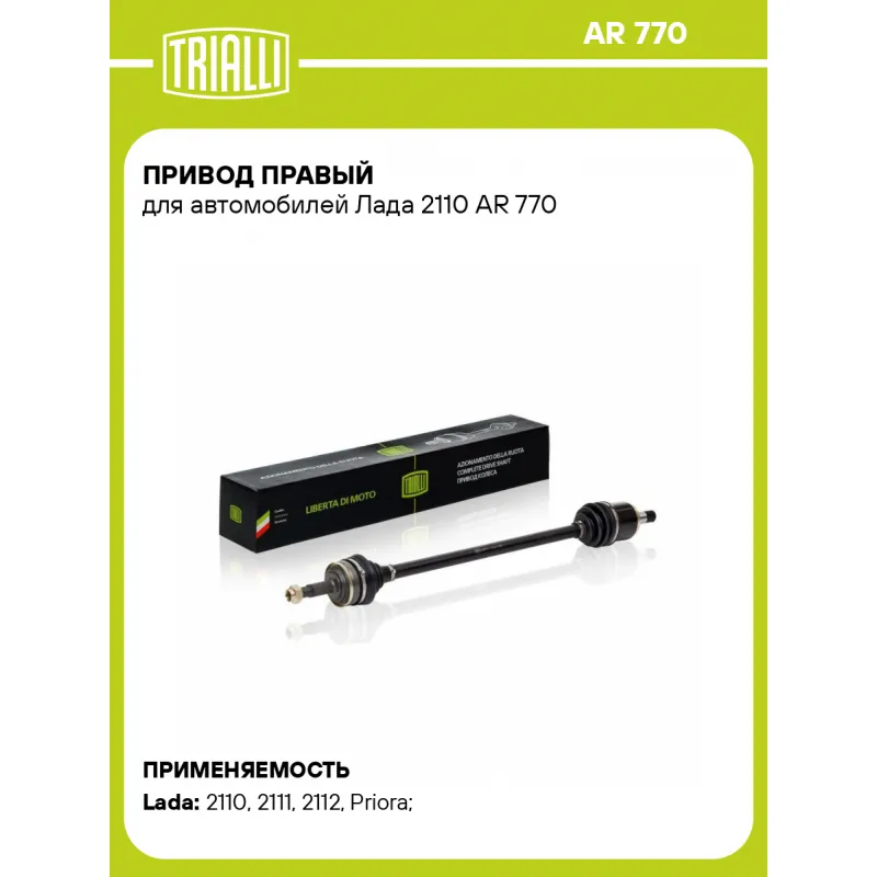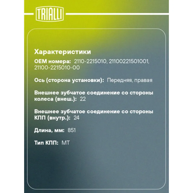 Привод правый для автомобилей Лада 2110 Характеристики: Артикул: AR 770 OEM номера: 2110-2215010, 21100221501001, 21100-2215010-00 Сопутствующие товары:: GO 284,GO 422,GO 423,FG 284 Гарантийный срок: 2 года/60 000 км Количество на автомобиль: 1 Ось (сторона установки): передняя, правая Внешнее зубчатое соединение со стороны колеса (внеш.): 22 Внешнее зубчатое соединение со стороны КПП (внутр.): 24 Длина, мм: 851 Тип КПП: MT Товарная линейка: BLACK Трансмиссия: М Подходит для авто: ВАЗ 2110, 2111, 2111, 2112, 2112, 2110, 2111, 2112, Priora (07-) Для проверки применяемости отправьте VIN автомобиля через вкладку "Есть вопросы о товаре?" Комплектация: Привод в сборе - 1 шт Гайка - 1 шт Гарантия: от 1 года.