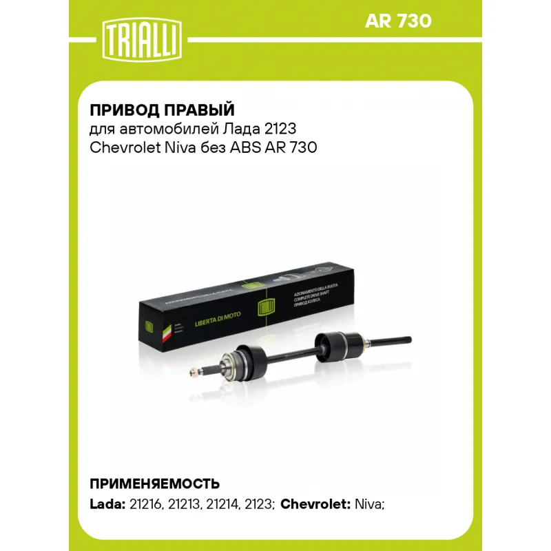 Привод правый для автомобилей Лада 2123 Chevrolet Niva без ABS Характеристики: Артикул: AR 730 OEM номера: 2123-2215010, 21230-2215010-00 Сопутствующие товары:: GO 233,GO 435,GO 434 Особенности конструкции:: шариковый Гарантийный срок: 2 года/60 000 км Парный товар: AR 731 Количество на автомобиль: 1 Ось (сторона установки): передняя, правая Внешнее зубчатое соединение со стороны колеса (внеш.): 24 Внешнее зубчатое соединение со стороны КПП (внутр.): 24 Длина, мм: 821.7 Диаметр вала,мм: 25 Тип КПП: MT Сопутствующий товар: ШРУСы: GO 212, GO 415, GO 414 Сопутствующий товар: Приводы: AR 731 Товарная линейка: BLACK КПП механика:: ВАЗ 21213, 21214 - с IV квартала 2003 г., ВАЗ 2131 – с сентября 2009 г. Подходит для авто: ВАЗ 21216, 21213, 21214, 21214, 2123 Chevrolet Niva (02-) Для проверки применяемости отправьте VIN автомобиля через вкладку "Есть вопросы о товаре?" Комплектация: Привод в сборе - 1 шт Гайка - 1 шт Гарантия: от 1 года.
