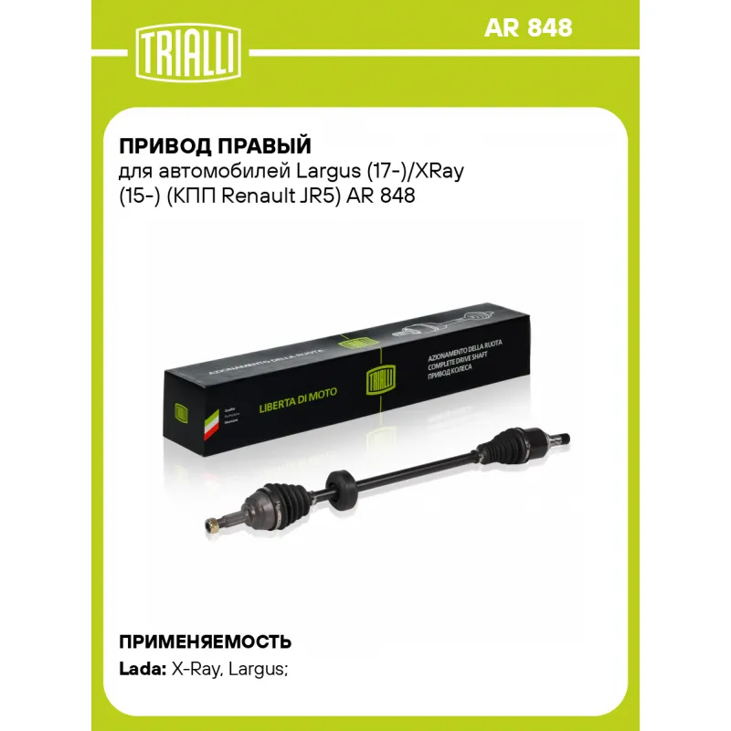 Привод правый для автомобилей Largus (17-)/XRay (15-) (КПП Renault JR5) Характеристики: Артикул: AR 848 OEM номера: 8450020057, 8450009549 Сопутствующие товары:: AR 849, GO 846, FG 846, GO 848, FG 840 Особенности конструкции:: с демпфером Гарантийный срок: 2 года/60 000 км Парный товар: AR 849 Количество на автомобиль: 1 Ось (сторона установки): передняя правая Внешнее зубчатое соединение со стороны колеса (внеш.): 23 Внешнее зубчатое соединение со стороны КПП (внутр.): 26 Длина, мм: 905 Диаметр вала,мм: 24.5 Тип КПП: MT Сопутствующий товар: ШРУСы: GO 848 Сопутствующий товар: Приводы: AR 847 Товарная линейка: BLACK Подходит для авто: ВАЗ X-Ray (15-), Largus (12-) Для проверки применяемости отправьте VIN автомобиля через вкладку "Есть вопросы о товаре?" Комплектация: Привод в сборе - 1 шт Гайка - 1 шт Гарантия: от 1 года.