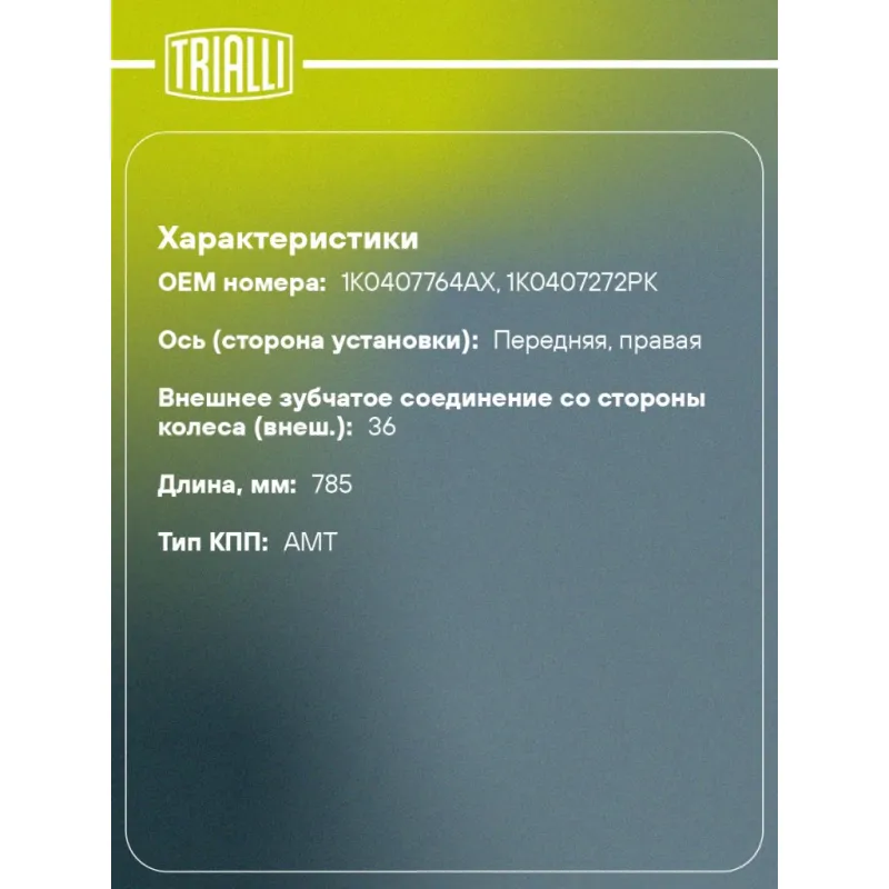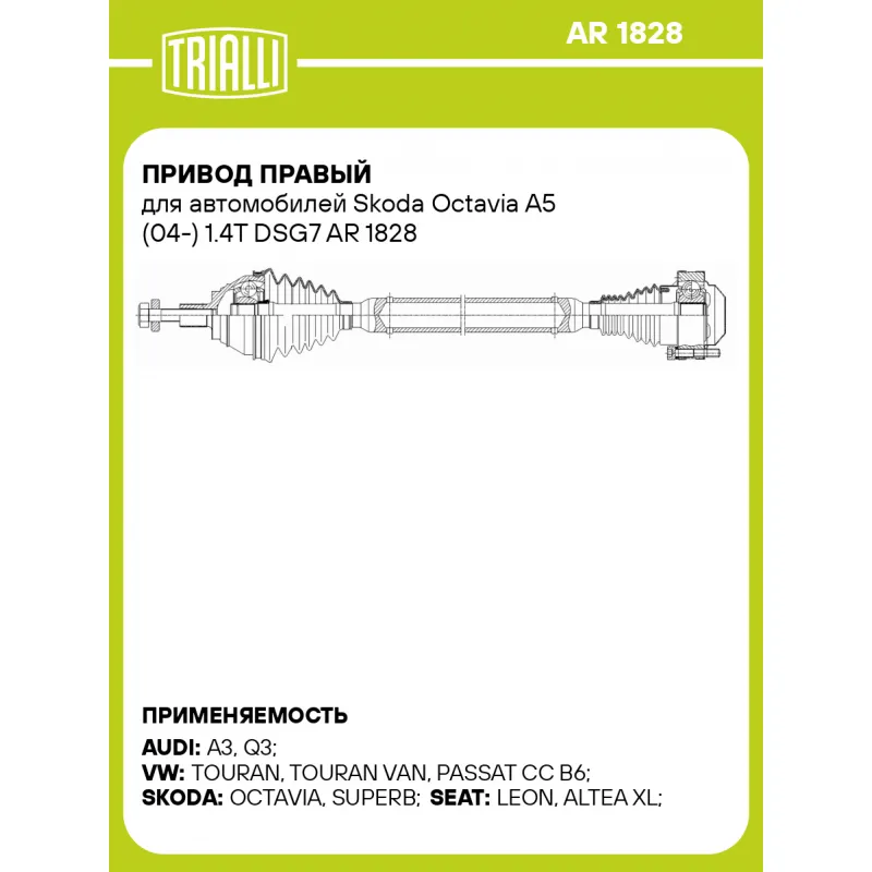 Привод правый для автомобилей Skoda Octavia A5 (04-) 1.4T DSG7 Характеристики: Артикул: AR 1828 OEM номера: 1K0407764AX, 1K0407272PK Ось (сторона установки): передняя, правая Длина, мм: 785 Внешнее зубчатое соединение со стороны колеса (внеш.): 36 Тип КПП: AMT Гарантийный срок: 2 года/60 000 км Сопутствующий товар: ШРУСы: GO 1838 Сопутствующий товар: Приводы: AR 1827 Количество на автомобиль: 1 Товарная линейка: BLACK Комплектация: Болт с шайбой - 1 шт Привод в сборе - 1 шт Болт - 6 шт Гарантия: от 1 года.