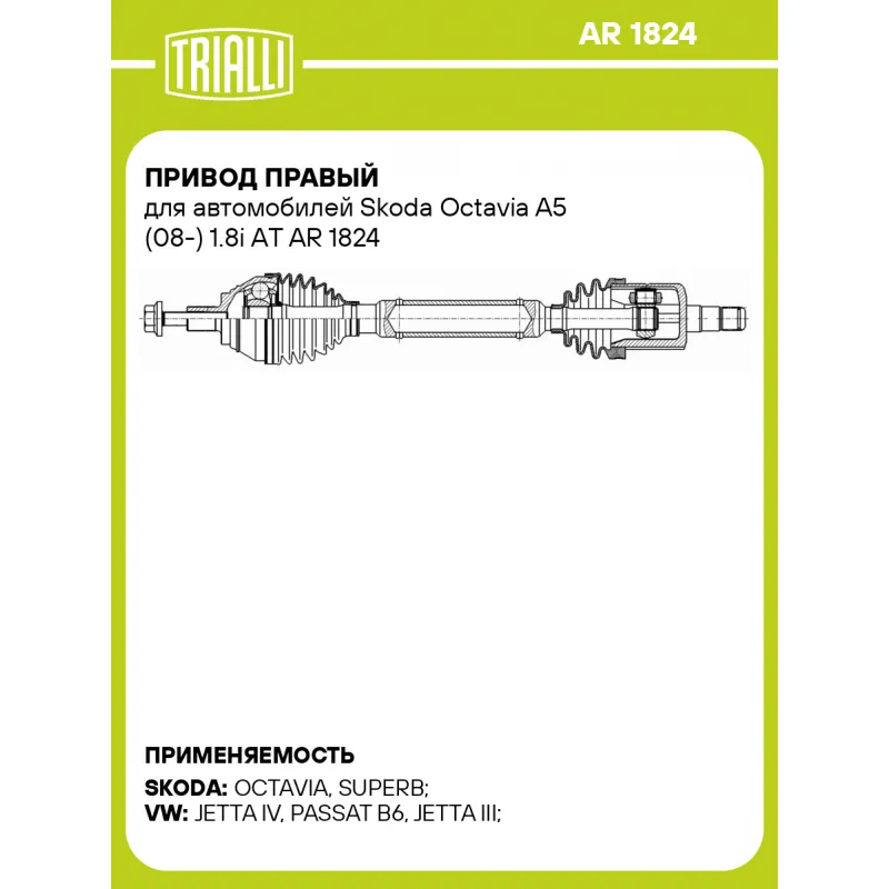 Привод правый для автомобилей Skoda Octavia A5 (08-) 1.8i АT Характеристики: Артикул: AR 1824 OEM номера: 1K0407272GE, 1K0407762KX Ось (сторона установки): передняя, правая Длина, мм: 883 Внешнее зубчатое соединение со стороны КПП (внутр.): 26 Внешнее зубчатое соединение со стороны колеса (внеш.): 36 Тип КПП: AT Гарантийный срок: 2 года/60 000 км Сопутствующий товар: Приводы: AR 1823 Количество на автомобиль: 1 Товарная линейка: BLACK Комплектация: Привод в сборе - 1 шт Болт - 1 шт Гарантия: от 1 года.