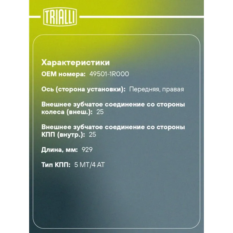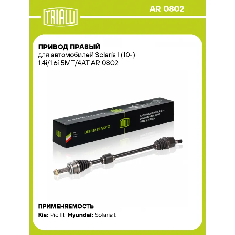 Привод правый для автомобилей Solaris I (10-) 1.4i/1.6i 5MT/4AT Характеристики: Артикул: AR 0802 OEM номера: 49501-1R000 Сопутствующие товары:: AR 0801, GO 0895, GO 073229 Особенности конструкции:: с демпфером Гарантийный срок: 2 года/60 000 км Парный товар: AR 0801 Количество на автомобиль: 1 Ось (сторона установки): передняя, правая Внешнее зубчатое соединение со стороны колеса (внеш.): 25 Внешнее зубчатое соединение со стороны КПП (внутр.): 25 Количество зубьев ABS: 48 Длина, мм: 929 Тип КПП: 5 MT/4 AT Товарная линейка: BLACK КПП: 5MT/4AT Подходит для авто: Kia Rio III (11-) Hyundai Solaris I (10-) Для проверки применяемости отправьте VIN автомобиля через вкладку "Есть вопросы о товаре?" Комплектация: Привод в сборе - 1 шт Гайка - 1 шт Гарантия: от 1 года.