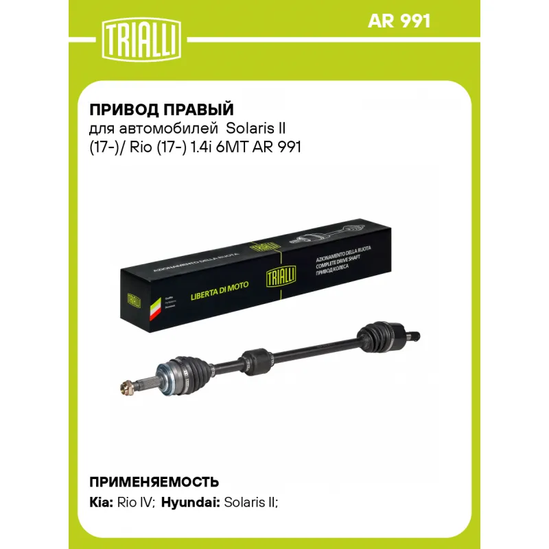 Привод правый для автомобилей Solaris II (17-)/ Rio (17-) 1.4i 6MT Характеристики: Артикул: AR 991 OEM номера: 49501-H5000 Особенности конструкции:: с демпфером Гарантийный срок: 2 года/60 000 км Парный товар: AR 990 Количество на автомобиль: 1 Ось (сторона установки): передняя, правая Внешнее зубчатое соединение со стороны колеса (внеш.): 25 Внешнее зубчатое соединение со стороны КПП (внутр.): 25 Длина, мм: 920 Диаметр вала,мм: 26 Тип КПП: 6 MT Сопутствующий товар: ШРУСы: GO 0824, GO 0895, GO 0856 Сопутствующий товар: Ремонтные комплекты ШРУСов: FG 0806, FG 0805 Сопутствующий товар: Приводы: AR 990 Товарная линейка: BLACK Подходит для авто: Kia Rio IV (17-) Hyundai Solaris II (17-) Для проверки применяемости отправьте VIN автомобиля через вкладку "Есть вопросы о товаре?" Комплектация: Привод в сборе - 1 шт Гайка - 1 шт Гарантия: от 1 года.