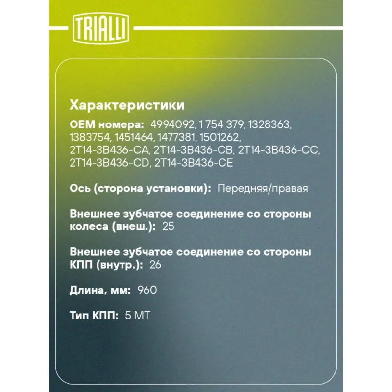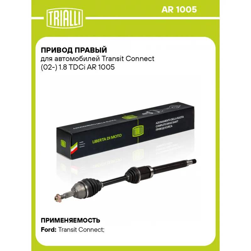 Привод правый для автомобилей Transit Connect (02-) 1.8 TDCi Характеристики: Артикул: AR 1005 OEM номера: 4994092, 1 754 379, 1328363, 1383754, 1451464, 1477381, 1501262, 2T14-3B436-CA, 2T14-3B436-CB, 2T14-3B436-CC, 2T14-3B436-CD, 2T14-3B436-CE, 2T14-3B436-CF, 4511905, 9T16-3B436-AA, 9T1Z3B436A Гарантийный срок: 2 года/60 000 км Парный товар: AR 1006 Количество на автомобиль: 1 Ось (сторона установки): передняя/правая Внешнее зубчатое соединение со стороны колеса (внеш.): 25 Внешнее зубчатое соединение со стороны КПП (внутр.): 26 Длина, мм: 960 Диаметр вала,мм: 26 Тип КПП: 5 MT Сопутствующий товар: ШРУСы: GO 1016; GO 1017; GO 1018 Сопутствующий товар: Ремонтные комплекты ШРУСов: FG 1004; FG 1005; FG 1019 Сопутствующий товар: Приводы: AR 1006 Товарная линейка: BLACK Подходит для авто: Ford Transit Connect (02-), Tourneo Connect I (02-), Transit Connect (02-) Для проверки применяемости отправьте VIN автомобиля через вкладку "Есть вопросы о товаре?" Комплектация: Привод - 1 шт Гайка - 1 шт Гарантия: от 1 года.