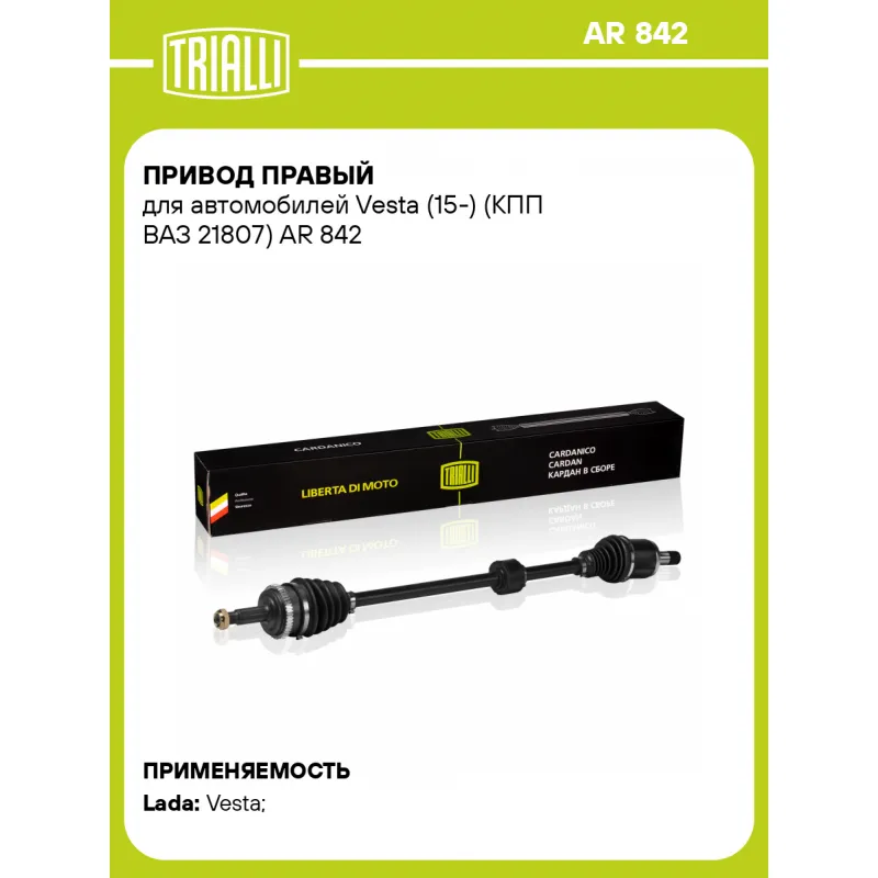 Привод правый для автомобилей Vesta (15-) (КПП ВАЗ 21807) Характеристики: Артикул: AR 842 OEM номера: 8450006570 Сопутствующие товары:: AR 843, GO 840, GO 842, FG 840, FG 841 Гарантийный срок: 2 года/60 000 км Парный товар: AR 843 Количество на автомобиль: 1 Ось (сторона установки): передняя правая Внешнее зубчатое соединение со стороны колеса (внеш.): 23 Внешнее зубчатое соединение со стороны КПП (внутр.): 24 Количество зубьев ABS: 48 Длина, мм: 913 Диаметр вала,мм: 24 Тип КПП: MT Товарная линейка: BLACK КПП: ВАЗ 21807 Подходит для авто: ВАЗ Vesta (15-) Для проверки применяемости отправьте VIN автомобиля через вкладку "Есть вопросы о товаре?" Комплектация: Привод в сборе - 1 шт Гарантийный талон - 1 шт Гарантия: от 1 года.