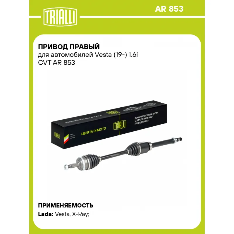 Привод правый для автомобилей Vesta (19-) 1.6i CVT Характеристики: Артикул: AR 853 OEM номера: 391004752R Гарантийный срок: 2 года/60 000 км Количество на автомобиль: 1 Ось (сторона установки): передняя, правая Внешнее зубчатое соединение со стороны колеса (внеш.): 23 Внешнее зубчатое соединение со стороны КПП (внутр.): 25 Количество зубьев ABS: 48 Длина, мм: 917.5 Диаметр вала,мм: 25 Тип КПП: CVT Сопутствующий товар: ШРУСы: GO 839 Сопутствующий товар: Ремонтные комплекты ШРУСов: FG 840 Сопутствующий товар: Приводы: AR 852 Товарная линейка: BLACK Подходит для авто: ВАЗ Vesta (15-), X-Ray (15-) Для проверки применяемости отправьте VIN автомобиля через вкладку "Есть вопросы о товаре?" Комплектация: Привод в сборе - 1 шт Гайка - 1 шт Гарантийный талон - 1 шт Гарантия: от 1 года.
