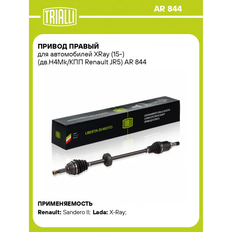 Привод правый для автомобилей XRay (15-) (дв.H4Mk/КПП Renault JR5) Характеристики: Артикул: AR 844 OEM номера: 391007857R Сопутствующие товары:: GO 843, GO 841, FG 840, FG 841 Особенности конструкции:: трипойдная конструкция Гарантийный срок: 2 года/60 000 км Парный товар: AR 845 Количество на автомобиль: 1 Ось (сторона установки): передняя правая Внешнее зубчатое соединение со стороны колеса (внеш.): 23 Внешнее зубчатое соединение со стороны КПП (внутр.): 26 Длина, мм: 892 Диаметр вала,мм: 25 Тип КПП: MT Товарная линейка: BLACK КПП: Renault JR5 Применяемость: С 24.03.2015 по 08.02.2018 Подходит для авто: Renault Sandero II (14-) ВАЗ X-Ray (15-) Для проверки применяемости отправьте VIN автомобиля через вкладку "Есть вопросы о товаре?" Комплектация: Привод в сборе - 1 шт Гайка - 1 шт Гарантия: от 1 года.